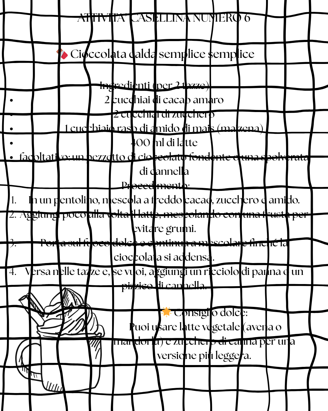 | Ulteriori informazioni relative al tempo attivo | La prima pagina rappresenta la facciata del calendario dell'avvento mentre la seconda le attività da fare assieme al bambino. alcune pagine contengono ricette e suggerimenti per affrontare l'attività della casellina. Il calendario è completamente personalizzabile. |
