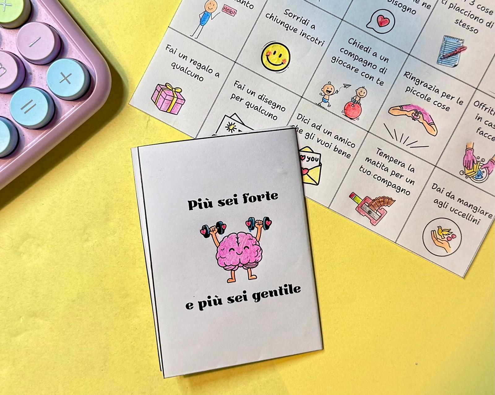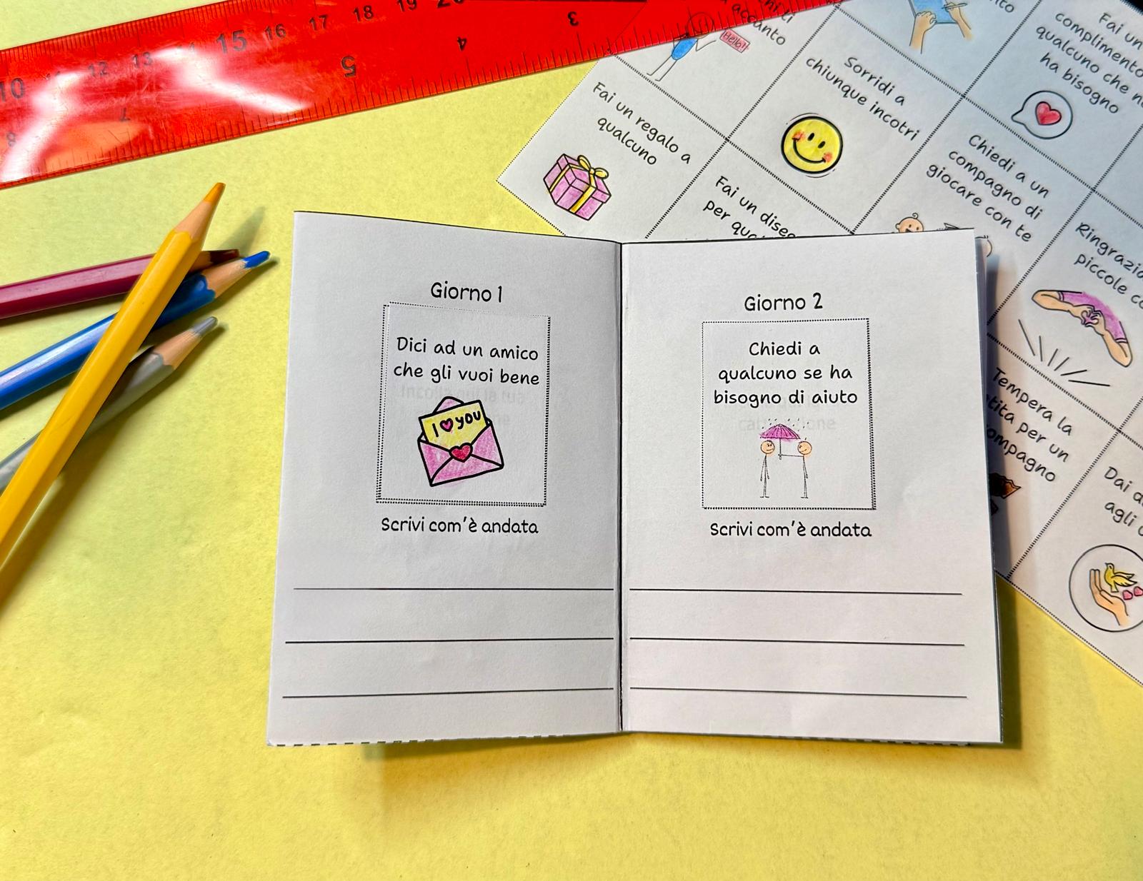 Un mini-libretto ricavato da un foglio A4 sul quale i bambini potranno ogni giorno impegnarsi per essere più gentili verso gli altri, verso la natura e anche verso sé stessi. Il file PDF è formato da: 💖Foglio A4 pronto alla stampa che permette di creare il libretto per la challenge, seguendo le pieghe e un piccolo taglio 💖Foglio A4 pronto alla stampa con degli stickers tra cui gli alunni potranno scegliere. Ogni sticker è una sfida gentile giornaliera da attaccare nell’apposita casella del libretto, uno per ogni giorno della settimana. 💖Istruzioni per la realizzazione del libretto I bambini potranno divertirsi a personalizzare il loro libricino e intanto riflettere sulle loro azioni, impegnandosi in piccole azioni gentili. Un’attività ricca di molti spunti, utile per riflettere e mettere in pratica la gentilezza ogni giorno.