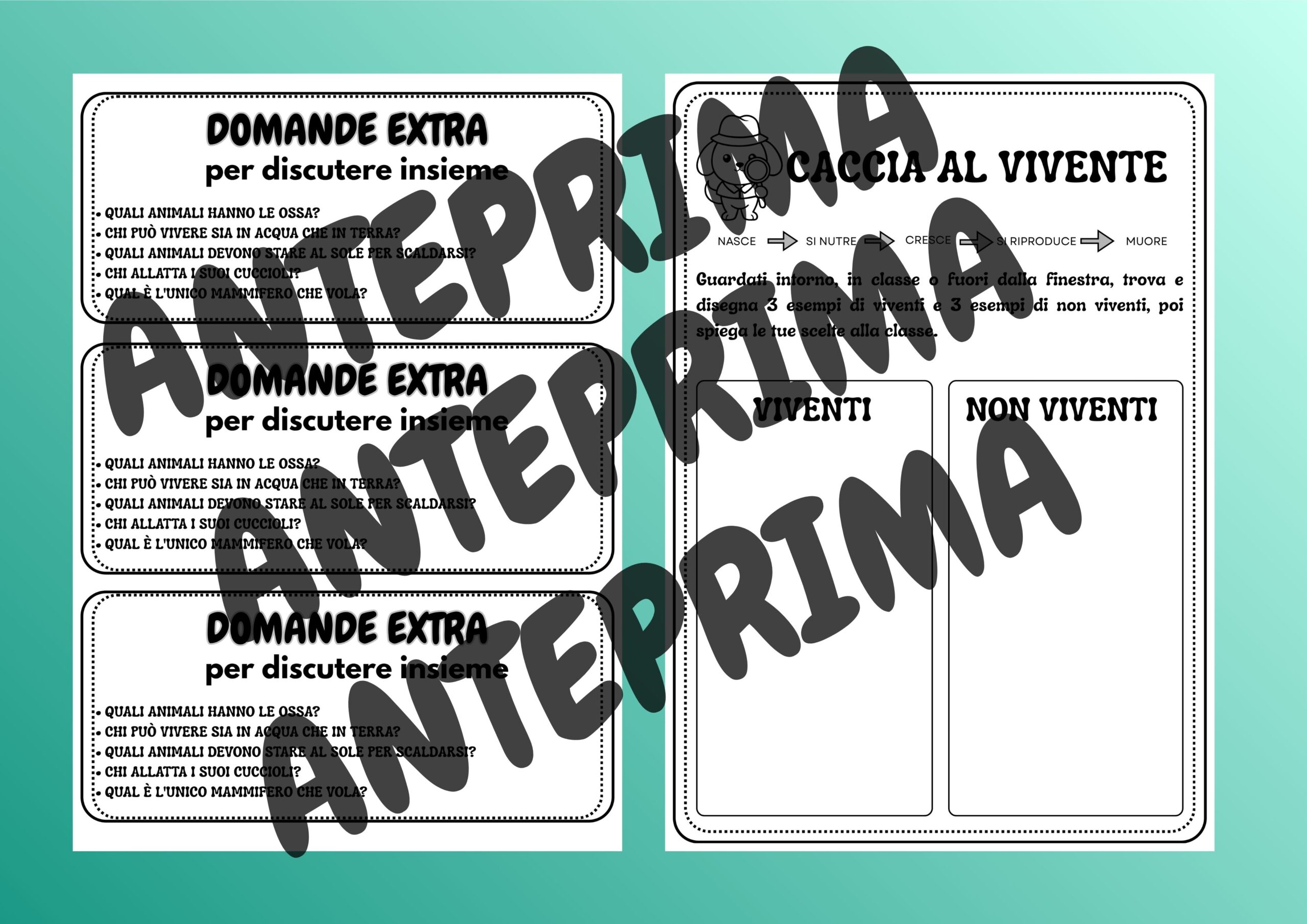 Questo kit di Scienze può essere utilizzato nelle classi 3°, 4° e 5°, si compone di 8 pagine, così divise : 🐺 L’animale misterioso: un gioco in cui i bambini pescano una carta con un animale, mimano e poi compilano la scheda con le caratteristiche (dove vive, come si muove, cosa mangia…) ♠️3 pagine con 24 tessere animale utilizzabili per il gioco ❓Domande extra di approfondimento per continuare a parlare di animali 🍀Caccia al vivente, attività di osservazione e creatività 🌱 Le parti della pianta 🌷Approfondimenti sulla pianta Le schede possono essere utilizzare per consolidare, ripassare o iniziare a parlare di animali, viventi e non viventi e delle parti della pianta. 🔗 Seguimi su Facebook per tantissime altre idee: facebook.com/profile.php?id=100076201810491 🛍️ Se ti fa piacere segui la mia pagina facebook: