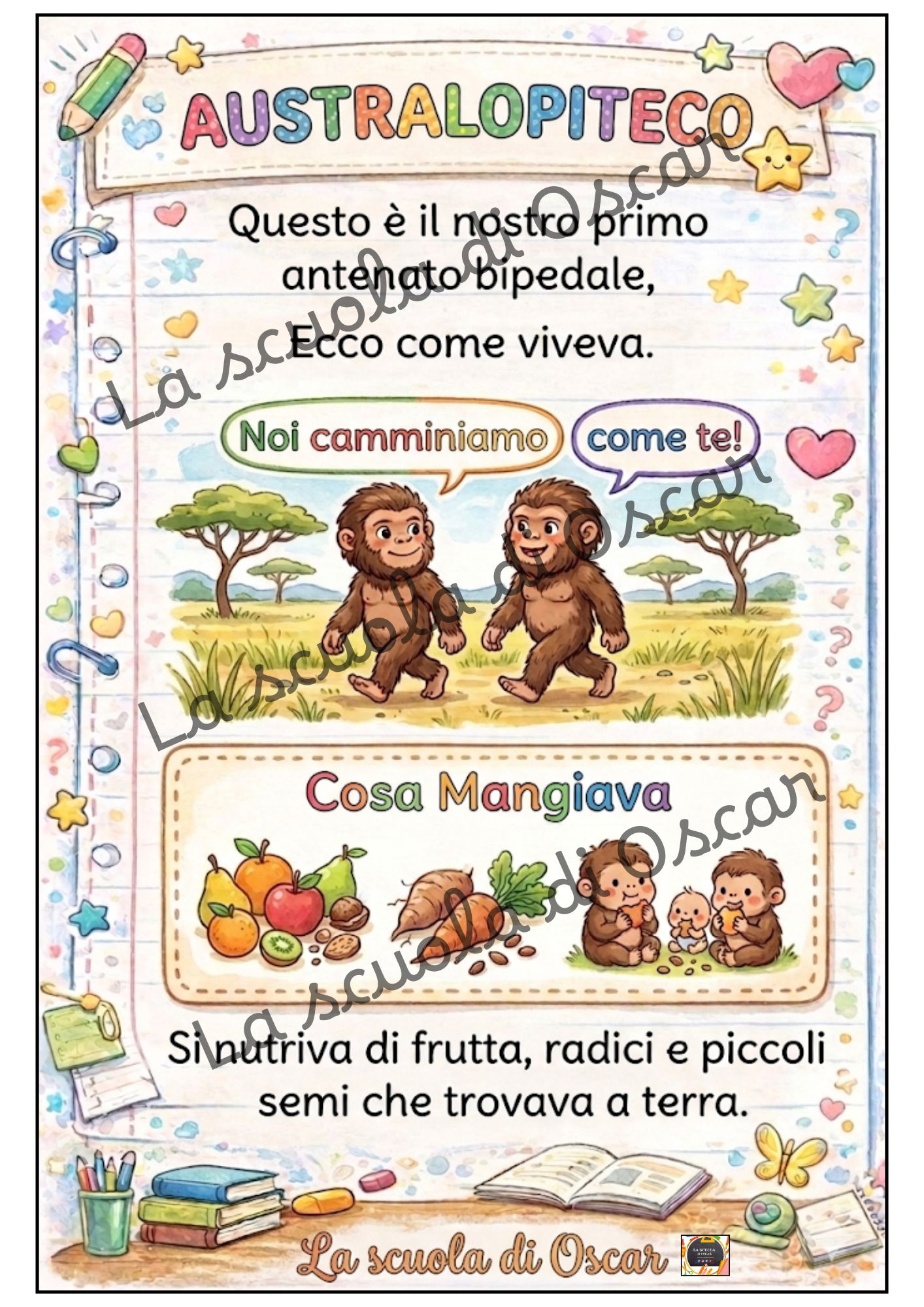 👣 L’Australopiteco viveva nella savana e fu il primo a decidere di alzarsi in piedi. Non era molto alto, ma il suo coraggio era immenso! Mangiava frutta e radici e guardava il mondo da una nuova prospettiva.”