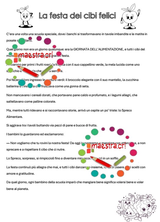 • Un racconto originale, La festa dei cibi felici, che affronta con leggerezza il tema dell’alimentazione consapevole e del rispetto per il cibo.