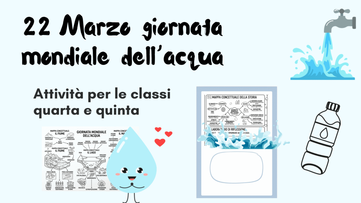 Cosa trovi in questo pacchetto: Un’introduzione coinvolgente: Scopri perché il 22 marzo celebriamo la Giornata Mondiale dell’Acqua, chi l’ha istituita e perché l’acqua dolce è così vitale per tutti noi. Mappe concettuali chiare e complete: Esplora in modo strutturato i problemi legati all’acqua (come inquinamento, spreco e cambiamenti climatici) e le soluzioni concrete (risparmio idrico, educazione e tecnologia). Approfondisci anche le caratteristiche di fiumi, laghi e mari con schemi dettagliati. Attività pratiche e creative: Coinvolgi i tuoi studenti con esercizi di riflessione come “Scrivi tre azioni per risparmiare acqua a casa” e “Disegna la tua goccia felice e creativa che protegge la Terra”. Compiti di scrittura stimolanti: Due attività di scrittura, “Intervista a una Goccia d’Acqua” e “Il Giorno in cui il Rubinetto rimase a secco”, incoraggiano la personificazione e la riflessione sull’importanza quotidiana dell’acqua. Materiale pronto all’uso: Tutto il necessario per le tue lezioni, con schede illustrate e attività ben strutturate che puoi stampare e usare subito. Con questo materiale, i tuoi studenti impareranno a: Comprendere il valore inestimabile dell’acqua dolce e la sua importanza fondamentale per la vita sul nostro pianeta. Identificare le principali minacce che mettono a rischio le risorse idriche globali. Conoscere e applicare strategie e azioni concrete per proteggere e risparmiare l’acqua nella vita di tutti i giorni. Sviluppare una consapevolezza critica sull’uso responsabile dell’acqua. Esprimere la propria creatività e il pensiero critico attraverso attività di scrittura e disegno. Acquisire conoscenze di base sugli ecosistemi acquatici, come fiumi, laghi e mari.