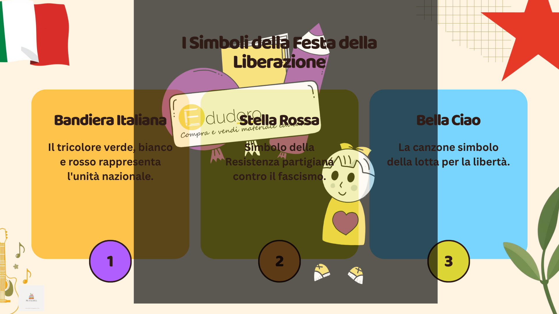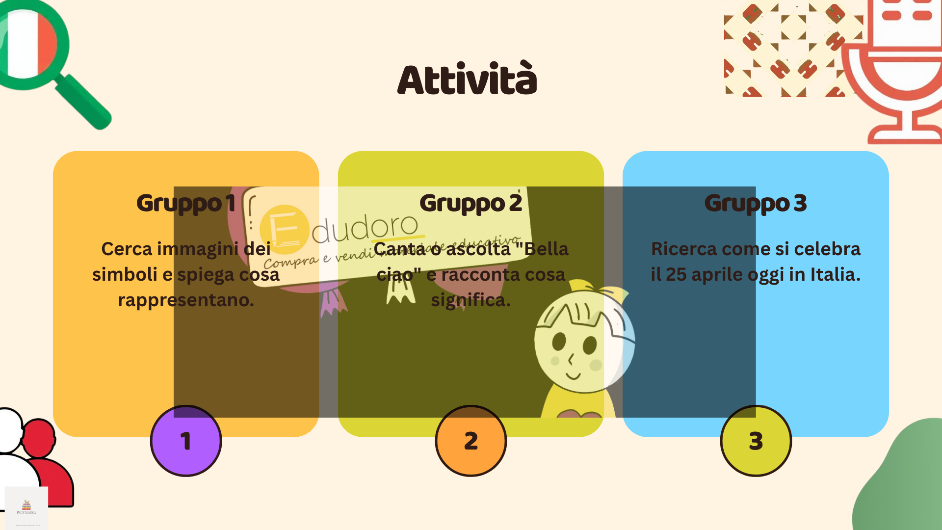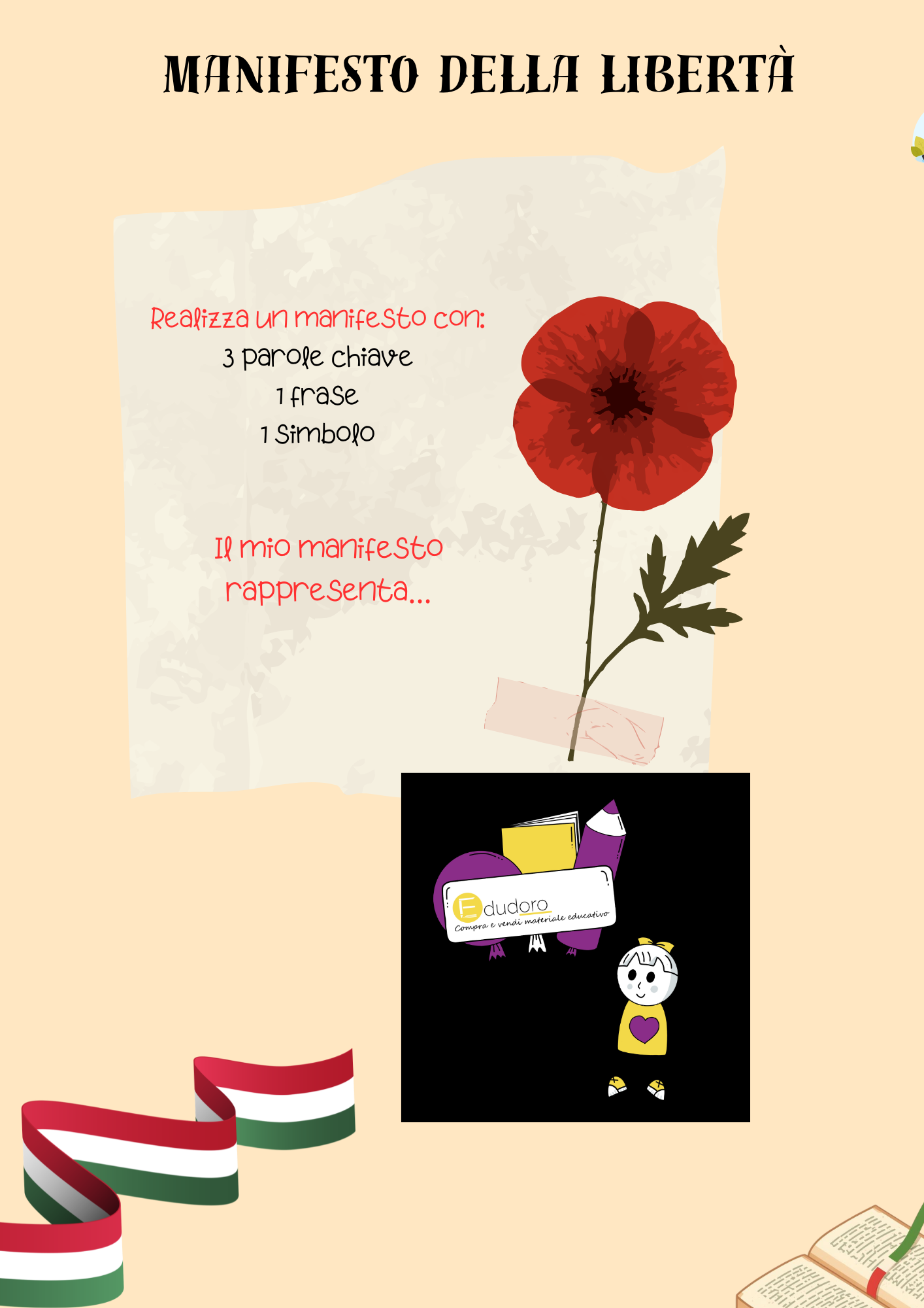 Cerchi un’attività coinvolgente, già pronta e significativa per affrontare il 25 aprile in classe? Questo kit laboratoriale ti permette di trasformare una ricorrenza storica in un’esperienza attiva, partecipata e realmente formativa per i tuoi studenti. 💡 COSA TROVERAI? ✔ Presentazione in pdf ✔Sei schede operative pronte all’uso con laboratori di scrittura e riflessione ✔ Guida docente completa con bibliografia e suggerimenti per BES/DSA 🚀 PERCHÉ SCEGLIERLO? * La presentazione è pensata per coinvolgere alunne/i * Puoi usare tutte le schede o quelle più adatte alla tua classe * Coinvolge tutta la classe (anche i più passivi) * Collega storia e cittadinanza in modo concreto * Sviluppa pensiero critico e competenze espressive 🧠 METODOLOGIA Didattica attiva e laboratoriale: gli studenti partecipano, riflettono, discutono e producono. ⏱️ DURATA 2 ore (modulabile e adattabile) 👥 DESTINATARI Scuola secondaria di I grado (adattabile anche alla quinta primaria) 🎯 OBIETTIVO Far comprendere il significato del 25 aprile non solo come evento storico, ma come valore attuale: la libertà come conquista da conoscere e difendere. ✨ IDEALE PER TE SE… * vuoi una lezione efficace * cerchi attività davvero coinvolgenti * lavori in classi eterogenee * vuoi portare in aula una didattica per competenze