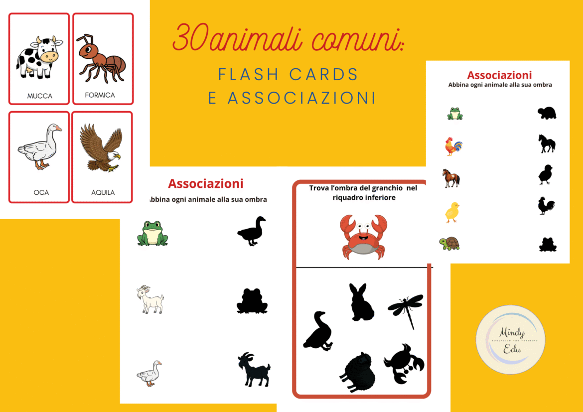 Raccolta di materiale didattico stampabile dedicata agli animali comuni, progettata per attività di associazione animale–ombra, discriminazione visiva e arricchimento del linguaggio.