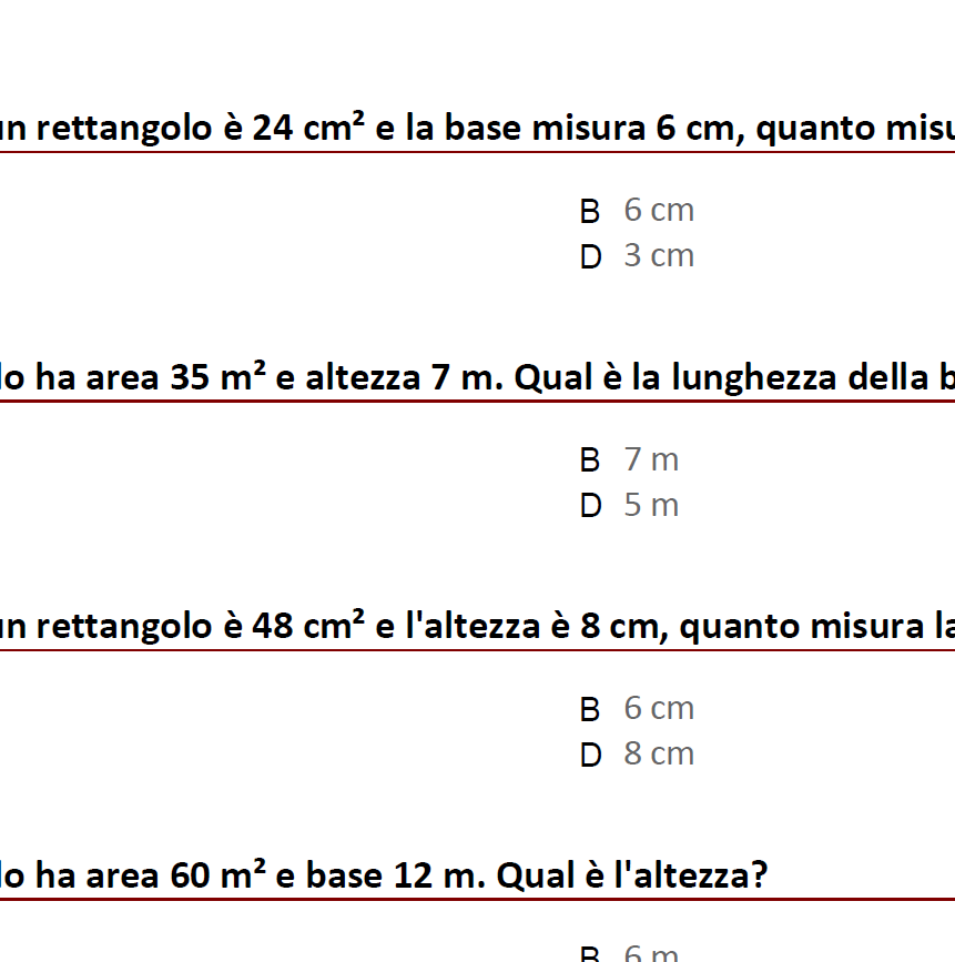 Questo file contiene 50 quesiti a risposta multipla, specificamente progettato per l’apprendimento e il consolidamento delle formule inverse per il calcolo dell’area di figure geometriche fondamentali. Il materiale si concentra sul calcolo della base o dell’altezza, partendo dall’area data. Il file include 25 esercizi sul quadrato e 25 sul rettangolo.