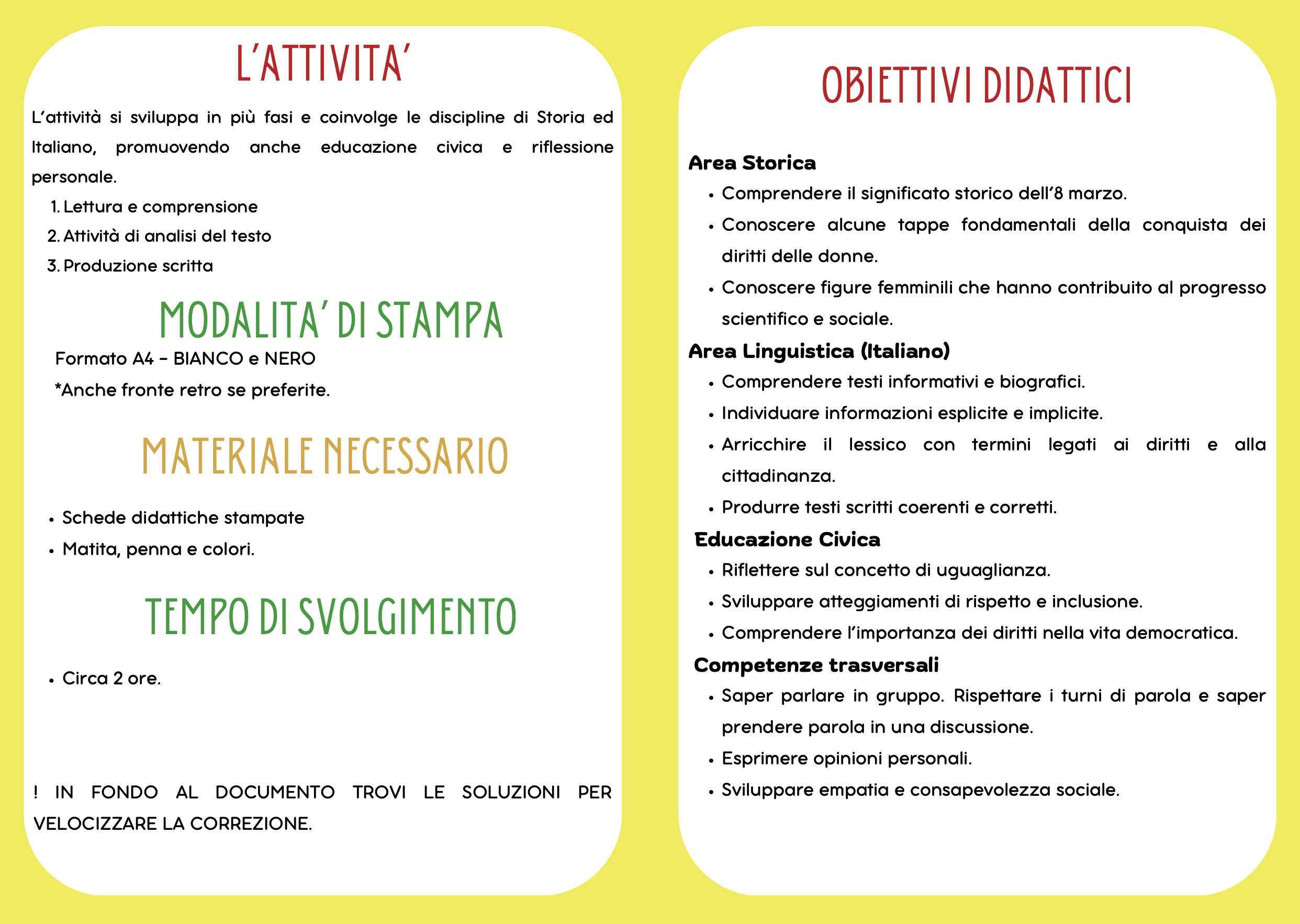 Attraverso testi chiari e accessibili, gli alunni scopriranno il valore dell’8 marzo, le conquiste dei diritti femminili e figure ispiratrici come Rita Levi-Montalcini e Samantha Cristoforetti