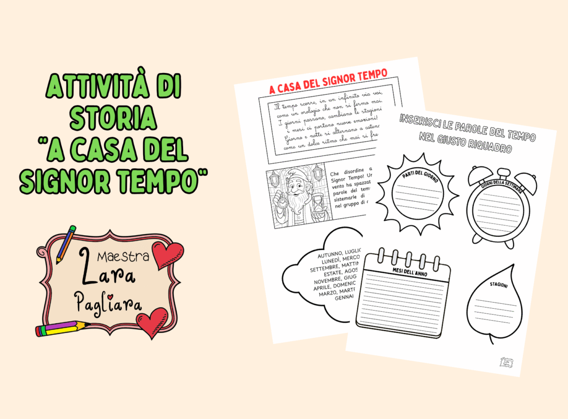 Questo materiale è ideale per introdurre le “parole del tempo” in classe prima o per un ripasso in classe seconda. Può anche essere utilizzato come scheda di verifica per gli alunni di seconda.