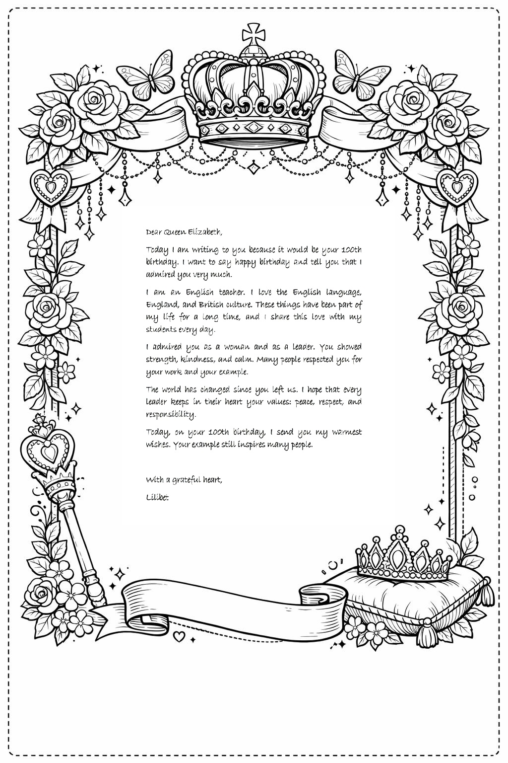 All’interno del file è presente anche una cornice pensata per la scrittura creativa: gli studenti potranno scrivere una loro lettera alla Regina, utilizzando gli strumenti a disposizione — emozioni, eventi storici, tratti caratteriali — a seconda dell’obiettivo didattico e del focus scelto da voi insegnanti.