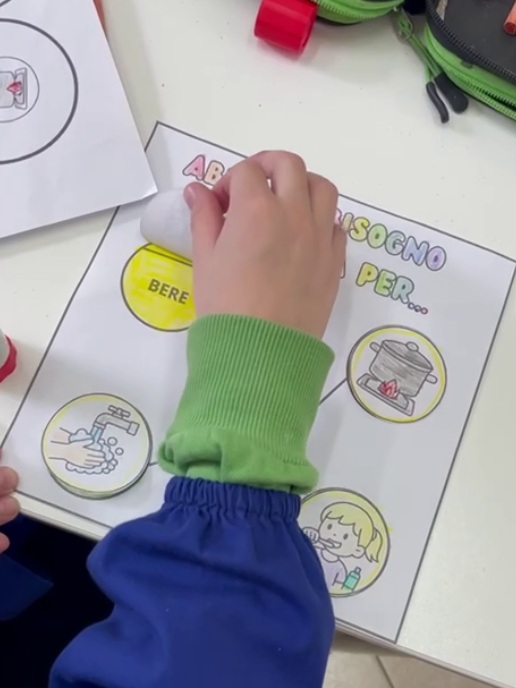 Il materiale propone un lavoro di associazione tra immagini e verbi: gli alunni dovranno ritagliare i cerchi posti sulla destra e incollarli accanto al verbo corrispondente, completando correttamente le frasi “Abbiamo bisogno dell’acqua per…”. Un’attività pratica che stimola il pensiero logico e favorisce la comprensione attraverso il canale visivo.