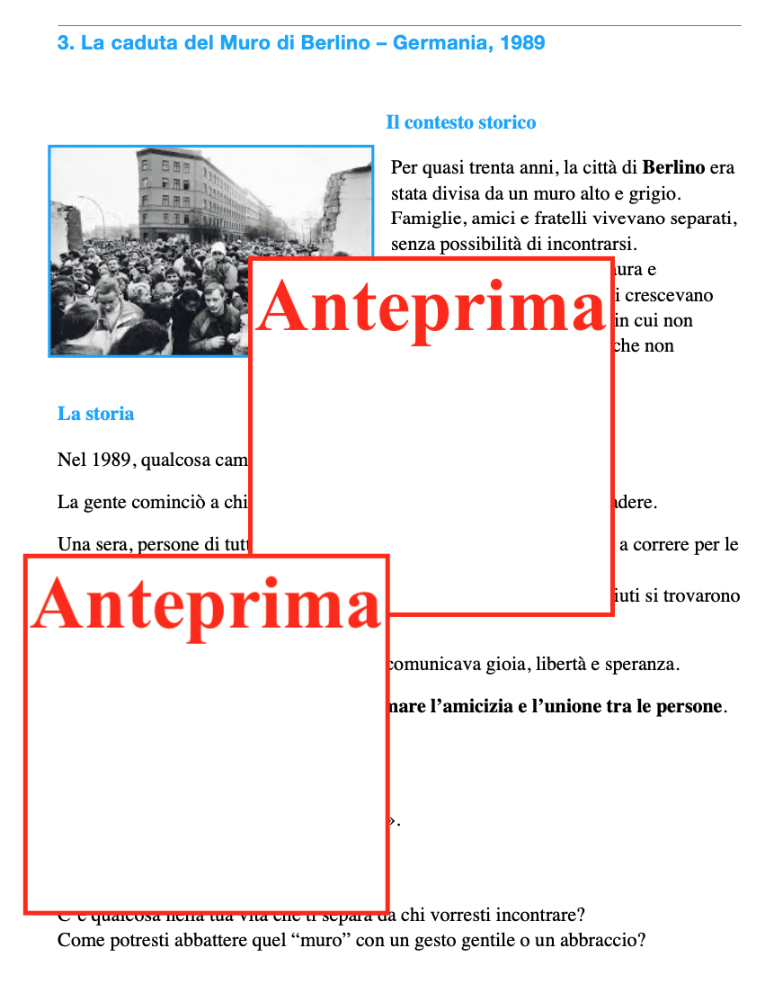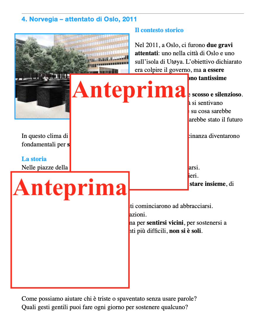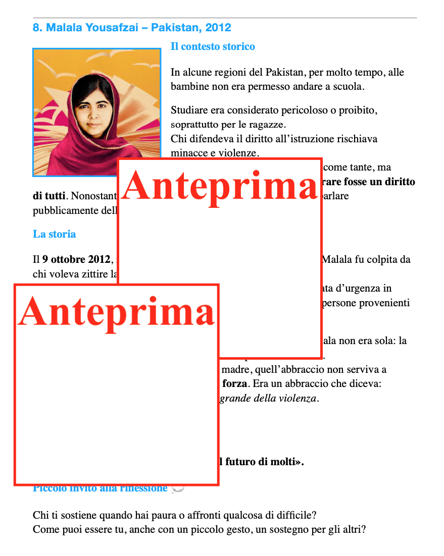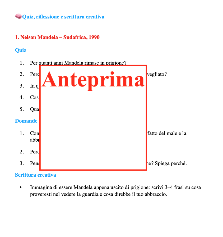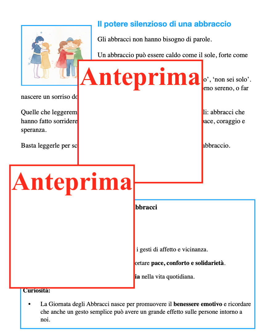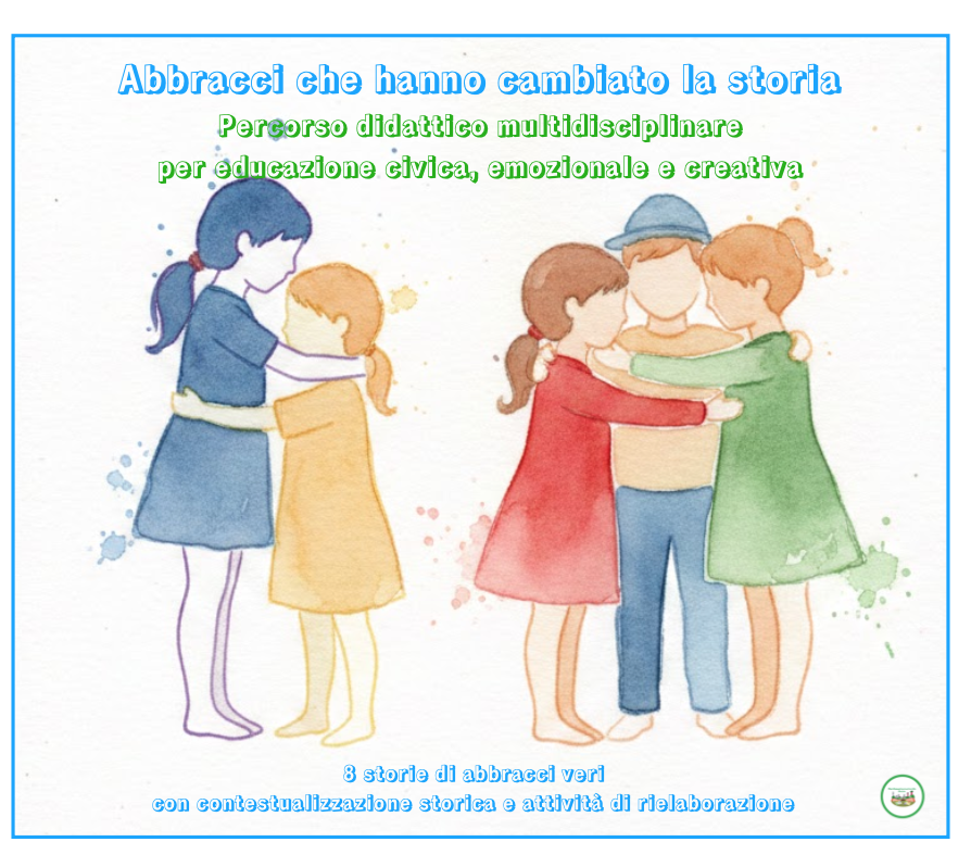 Educare alla cittadinanza significa anche educare alle relazioni, alla cura degli altri e alla gestione delle emozioni. Questo percorso propone otto storie realmente accadute, in contesti storici diversi, dove un semplice abbraccio ha lasciato un segno profondo. I bambini scopriranno che: -i grandi cambiamenti non passano solo da parole solenni o azioni eroiche; -spesso sono i gesti silenziosi di vicinanza, sostegno e coraggio a segnare la storia; -la storia è fatta di persone, scelte, emozioni e relazioni. Contenuti: -Lettura introduttiva sul valore dell’abbraccio come gesto universale; -Otto storie reali (Mandela, Norvegia, Rosa Parks, Papa Giovanni XXIII, Olimpiadi, Malala e altre) con narrazione accessibile, contesto storico e significato del gesto; -Attività guidate di riflessione, scrittura creativa, drammatizzazione e arte; -Strumenti per collegare storia e vita quotidiana, sviluppare empatia e consapevolezza emotiva. L’abbraccio diventa così un linguaggio universale, capace di parlare anche ai più piccoli. Ideale per: Giornata degli Abbracci o progetti trasversali durante l’anno scolastico; Integrazione in storia, italiano, educazione civica ed espressione artistica; Sviluppo di competenze socio-emotive e civiche nei bambini. Il percorso propone esperienze che permettono di: -ascoltare e comprendere; -riflettere e discutere in modo guidato; -esprimere emozioni attraverso parole, immagini e corpo; -collaborare e confrontarsi; -collegare la storia al proprio vissuto quotidiano. Cosa resta ai bambini una comprensione più profonda dei valori civici; maggiore empatia e consapevolezza emotiva; strumenti per leggere le relazioni e i conflitti; l’idea che anche loro, nel piccolo, possano fare la differenza. Perché portarlo in classe Perché educare oggi significa anche insegnare a: stare accanto, ascoltare, sostenere, scegliere la gentilezza. E perché, a volte, un abbraccio racconta la storia meglio di molte parole.