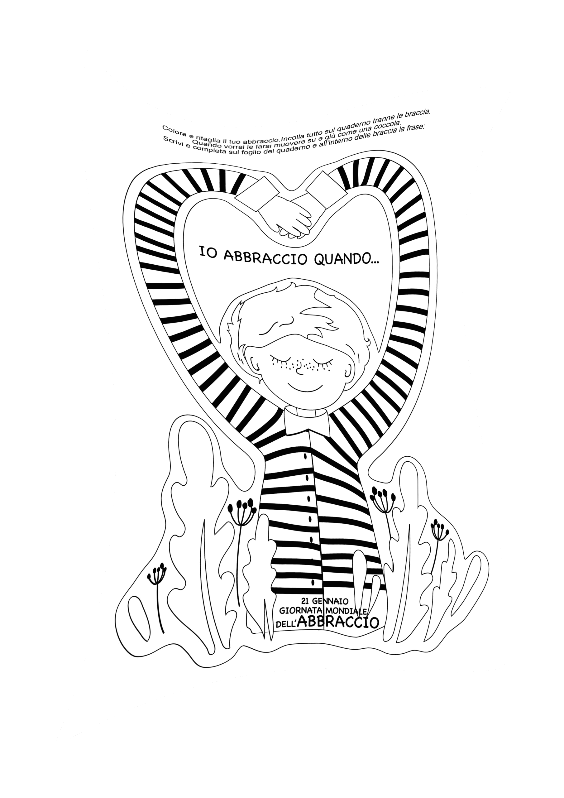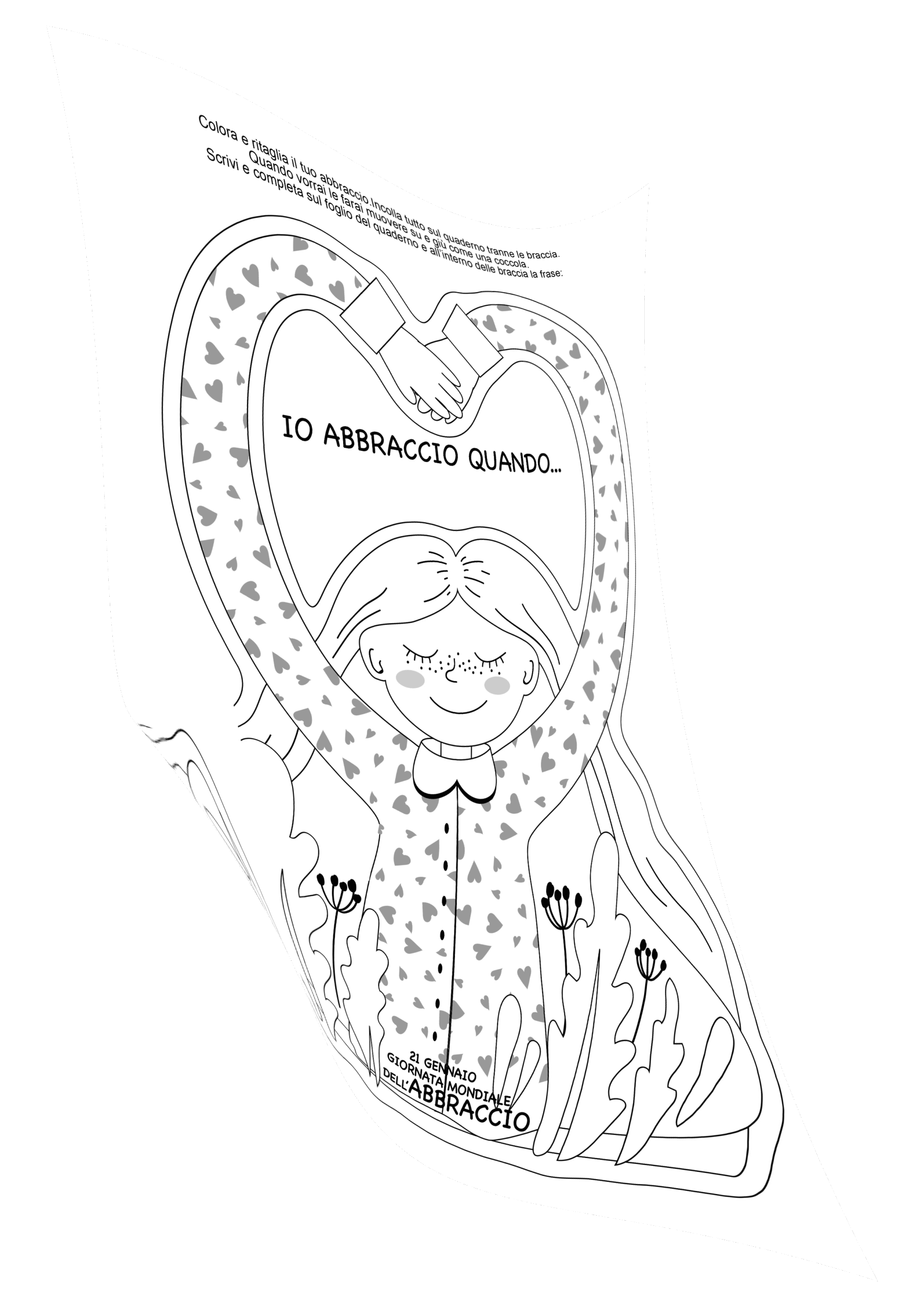 In occasione della Giornata Mondiale dell’Abbraccio (21 gennaio), l’attività propone due illustrazioni (maschile e femminile), disponibili a colori e in bianco e nero, con braccia lunghe da ritagliare e non incollare. Le braccia restano mobili e possono essere fatte salire e scendere, trasformando l’abbraccio in un’esperienza concreta e simbolica.