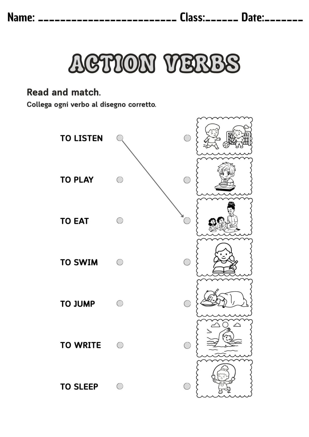 L’attività guida gli alunni a riconoscere e associare i principali verbi d’azione in inglese attraverso un esercizio di collegamento parola-immagine, favorendo la comprensione del lessico in modo visivo e concreto.