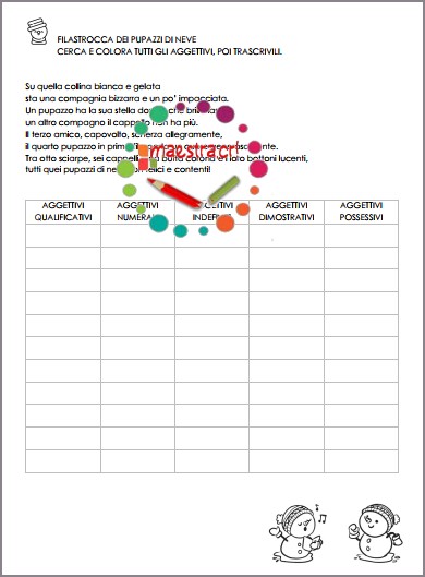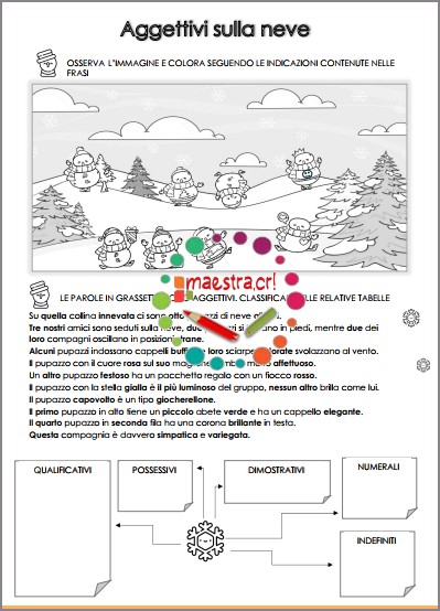 • Una filastrocca giocosa sui pupazzi di neve che invita i bambini a individuare, colorare e ordinare gli aggettivi presenti nel testo.