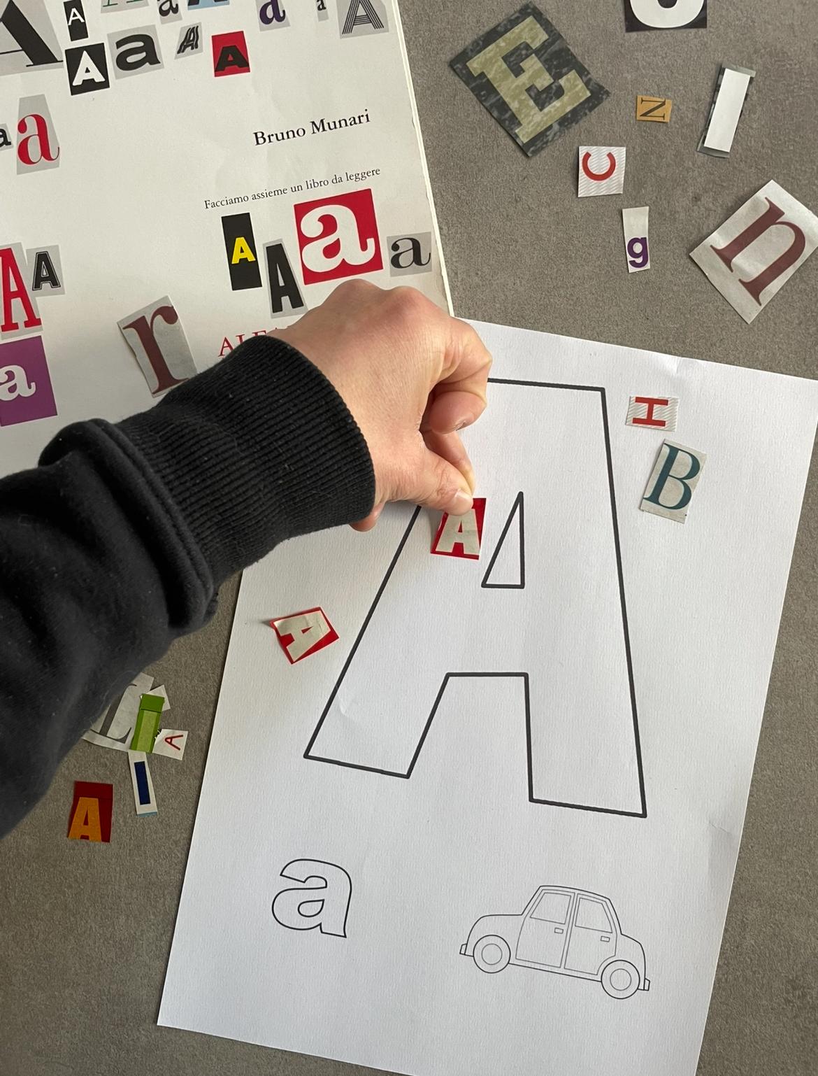 Le incollano a piacere sulla scheda, associano immagini. Ogni bambino avrà alla fine, un libro diverso, il suo primo alfabetiere.