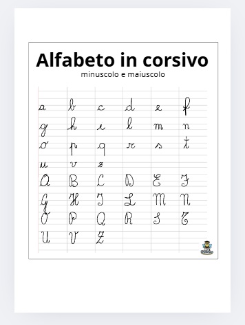 In questa scheda troverai l’alfabeto in corsivo maiuscolo e minuscolo separati ma all’interno di un’unica scheda.