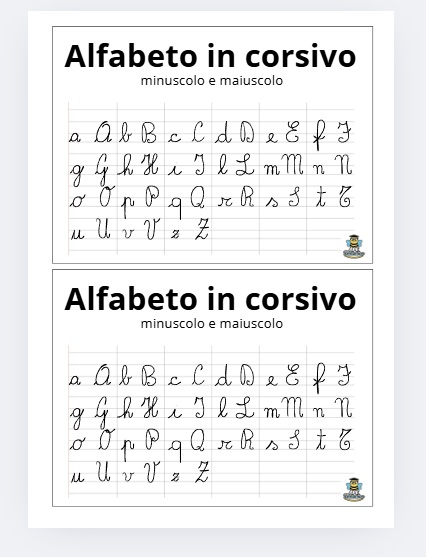 Scheda con doppio alfabeto italiano in corsivo maiuscolo e minuscolo.
