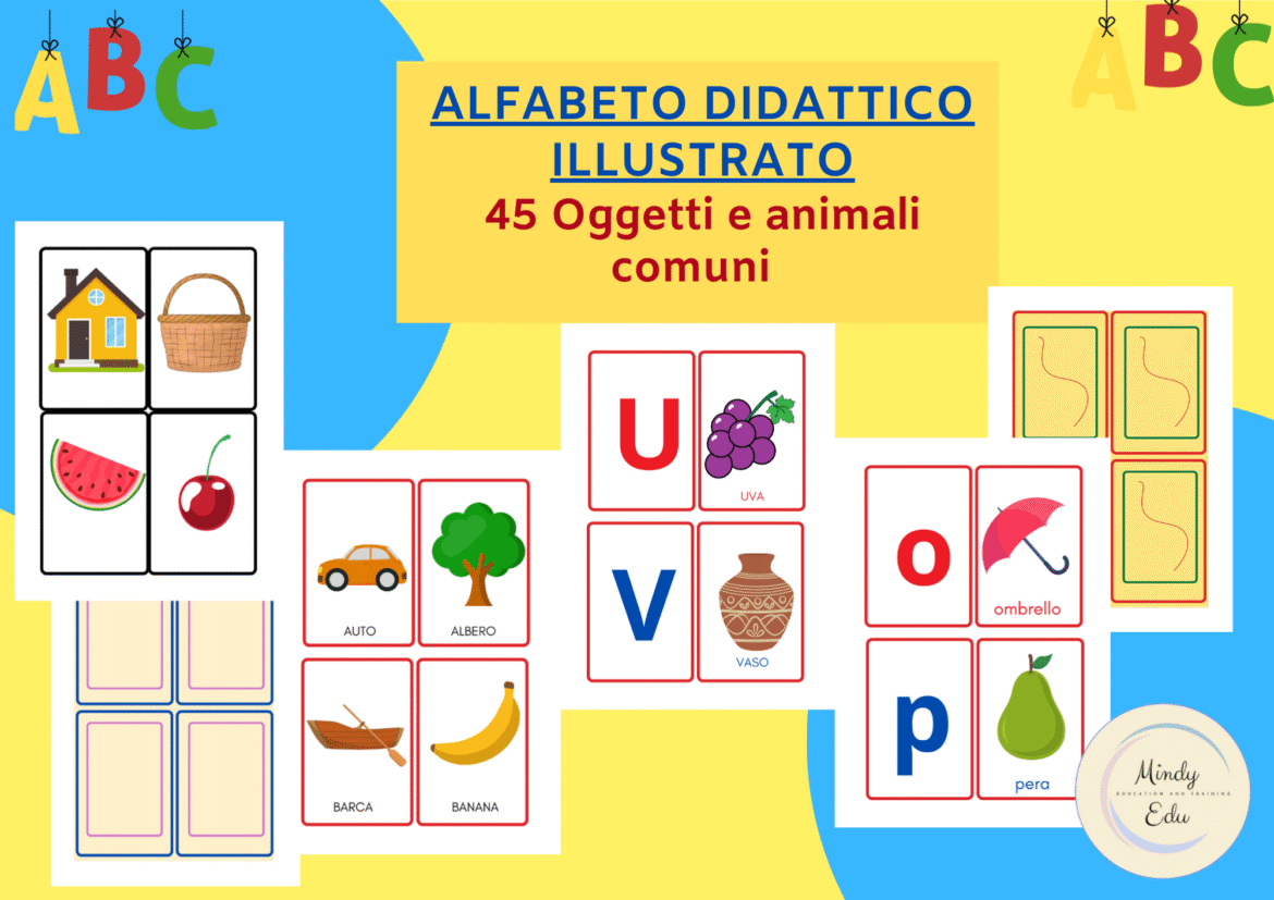 - 45 carte illustrate uniche in formati diversi: Ogni carta presenta una lettera dell’alfabeto e un’immagine chiara di un oggetto o animale comune che inizia con quella lettera.