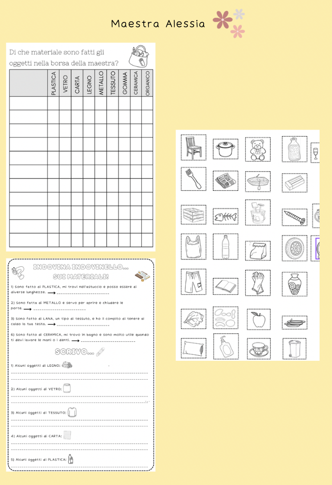 3) Attività di ritaglio: il bambino deve creare degli insiemi sul quaderno (carta, metallo, organico ecc.) e in ciascun insieme deve incollare la tessera raffigurante l’oggetto fatto del medesimo materiale (es: giornale –> carta).