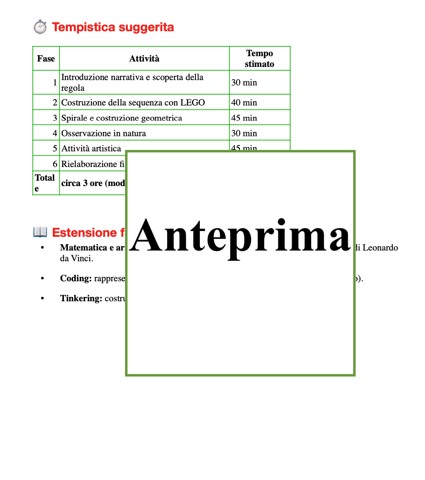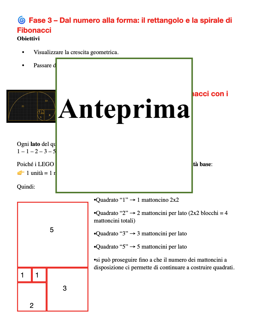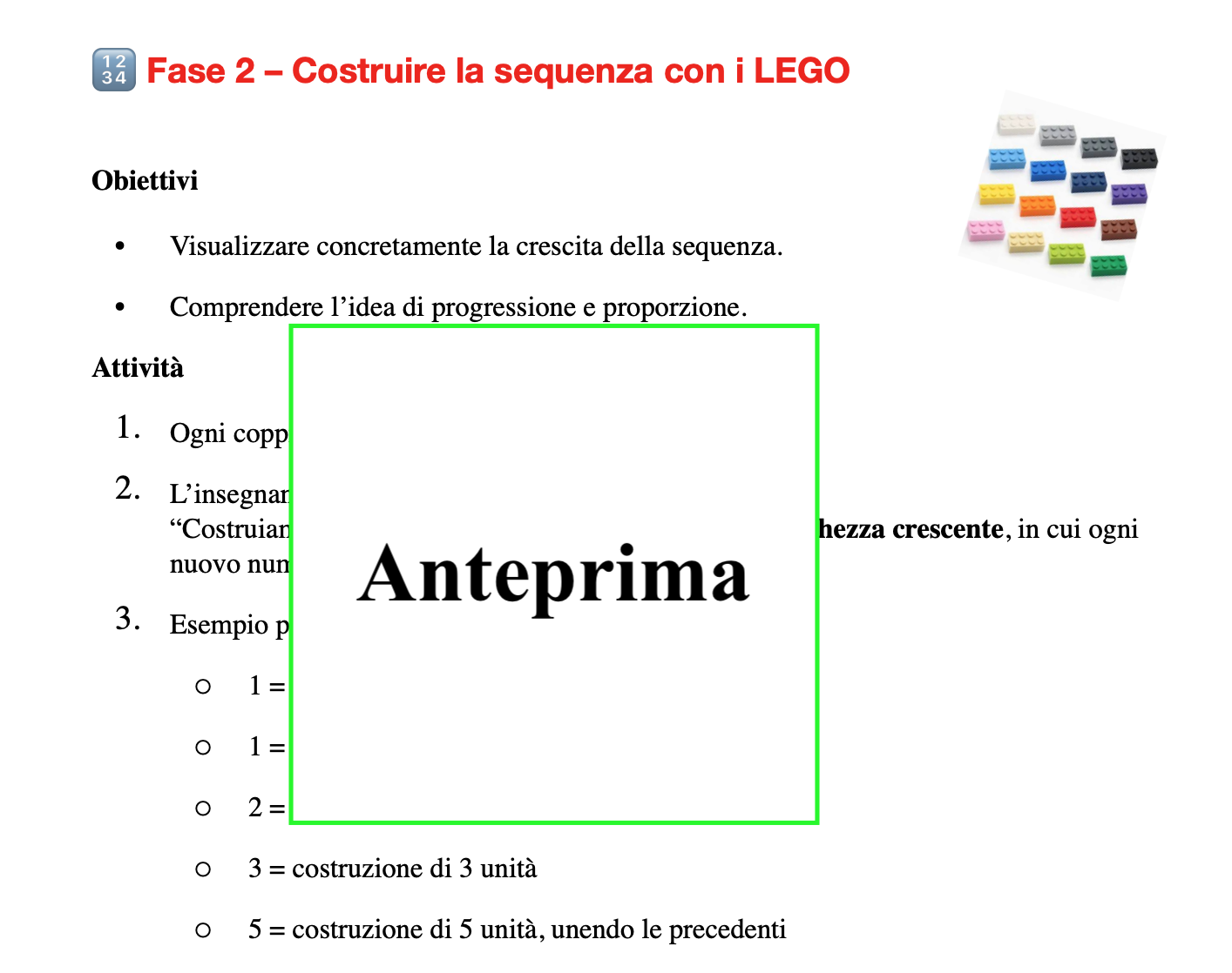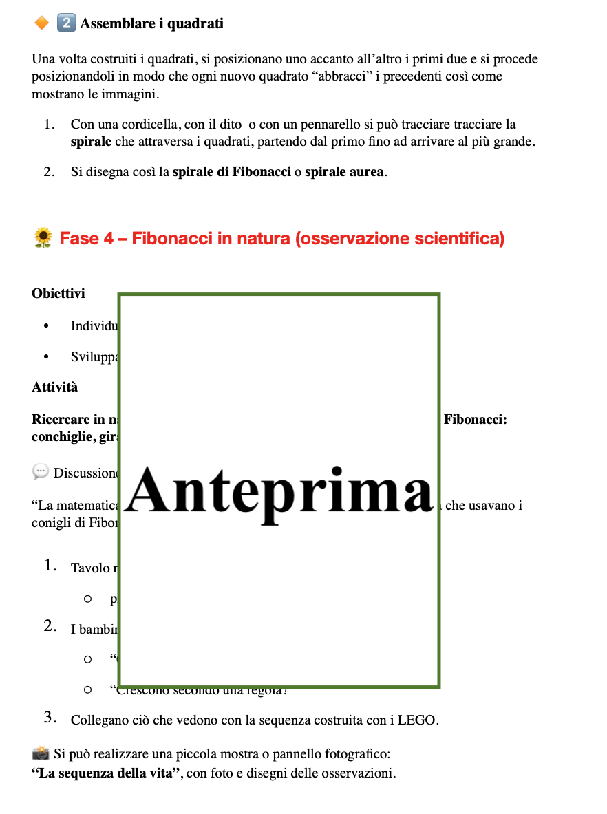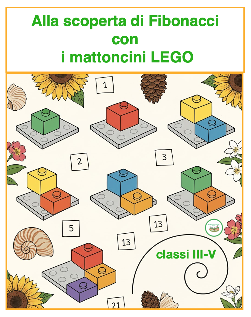🧱 Costruire Fibonacci con i LEGO 🌟 Introduzione Un viaggio tra storia, numeri e meraviglia. Attraverso la figura di Leonardo Fibonacci e la sua celebre sequenza, i bambini scoprono come la matematica non viva solo nei libri, ma si costruisca con le mani e si ritrovi in ogni forma della natura. I mattoncini LEGO diventano strumenti per vedere e toccare la crescita dei numeri, proprio come accade nei petali dei fiori, nelle conchiglie e nei rami degli alberi. 🎯 Obiettivi Avvicinare i bambini alla sequenza di Fibonacci in modo concreto e intuitivo. Sperimentare la relazione tra numero, forma e crescita. Promuovere cooperazione, osservazione e scoperta attiva attraverso il gioco costruttivo. Collegare la matematica alla natura e alla sua armonia. Stimolare curiosità, meraviglia e senso estetico nei confronti dei numeri. 📚 Contenuti del materiale Testo narrativo su Leonardo Fibonacci e la nascita della sequenza. Costruzione della sequenza con i mattoncini LEGO. Realizzazione della spirale aurea: dai quadrati numerici alla forma armonica finale. Fibonacci in natura: osservazione scientifica di forme che seguono la stessa regola (fiori, pigne, conchiglie…). Arte e armonia: la spirale aurea come ispirazione creativa. Sfida finale: ricostruisci la sequenza! Rielaborazione e documentazione dell’esperienza attraverso disegno, foto o narrazione.