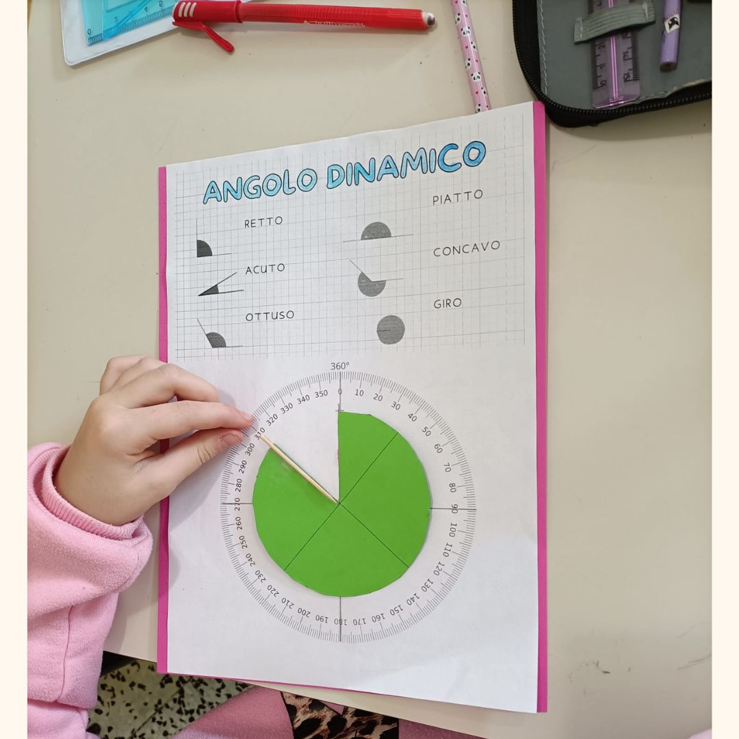 Ecco il modello per costruire un angolo dinamico.  Questo strumento è utilissimo per esercitarsi a riconoscere e rappresentare angoli. Vedere l’angolo che “si apre” fisicamente aiuta gli alunni a capire la differenza tra le varie ampiezze.