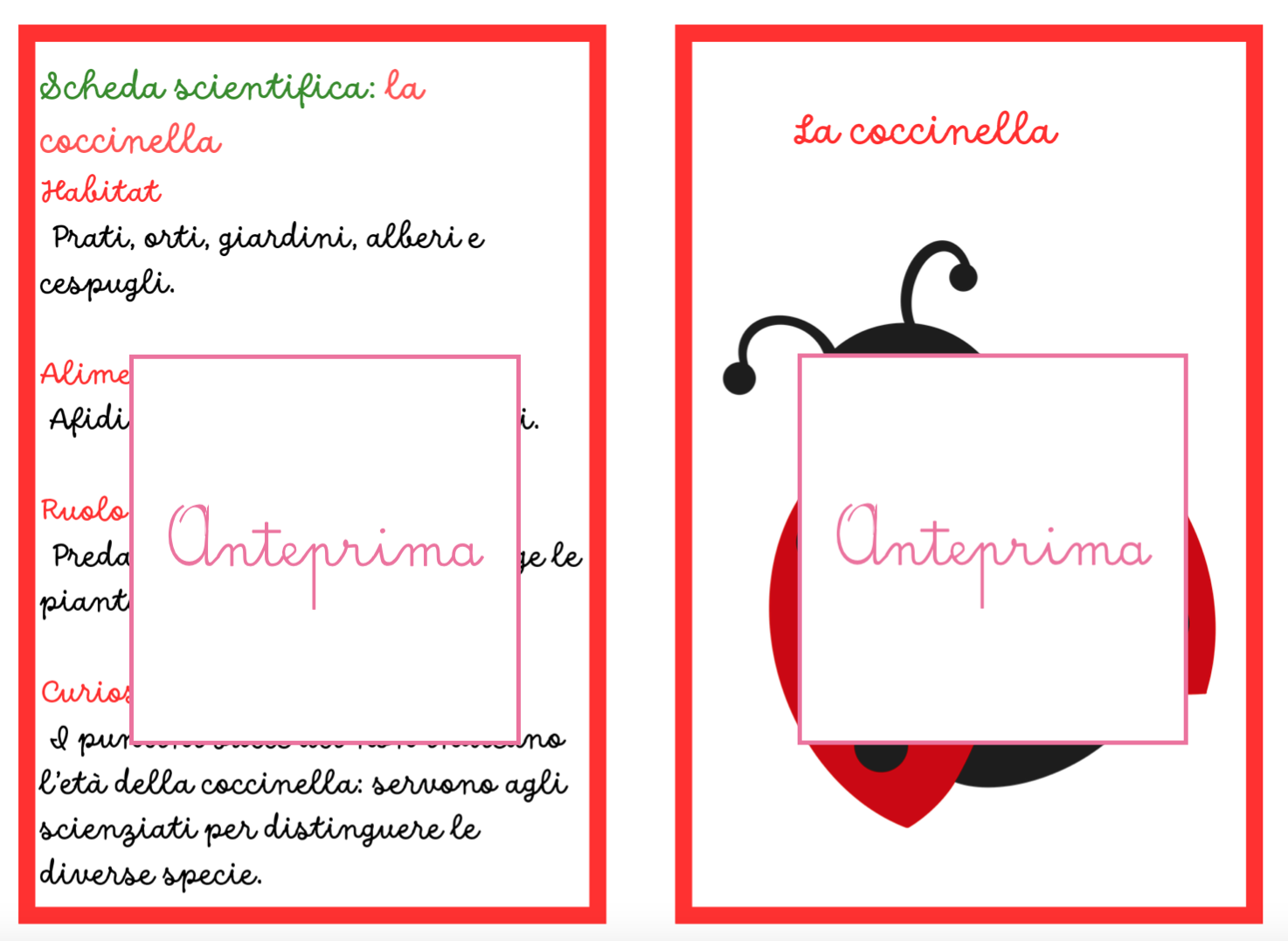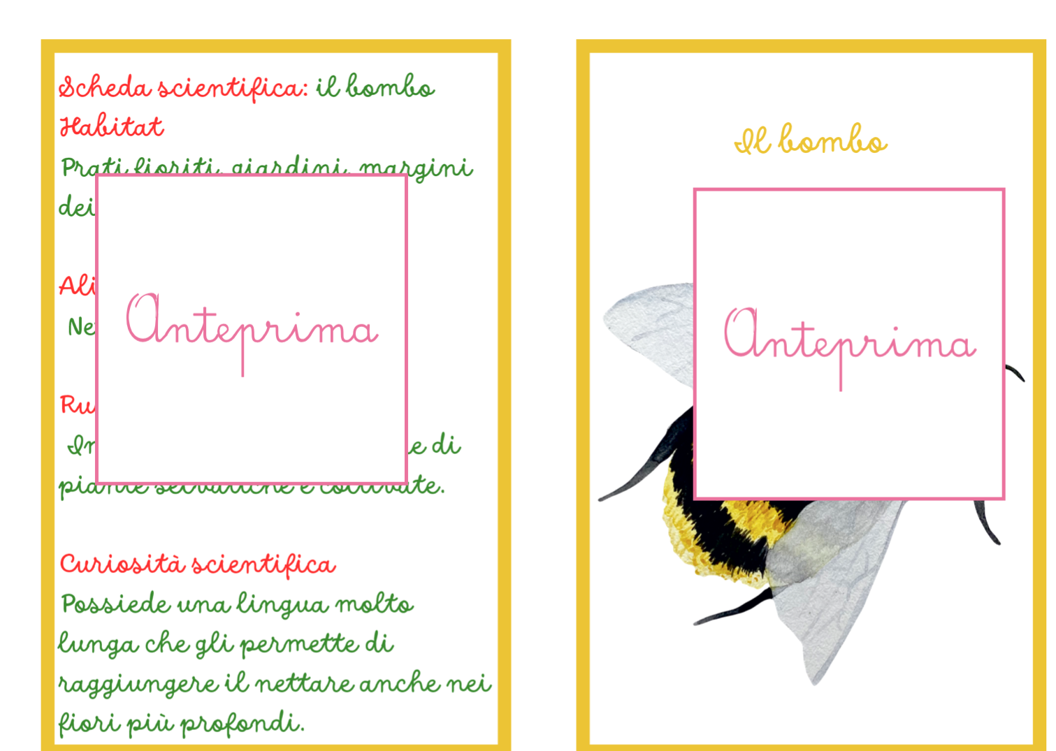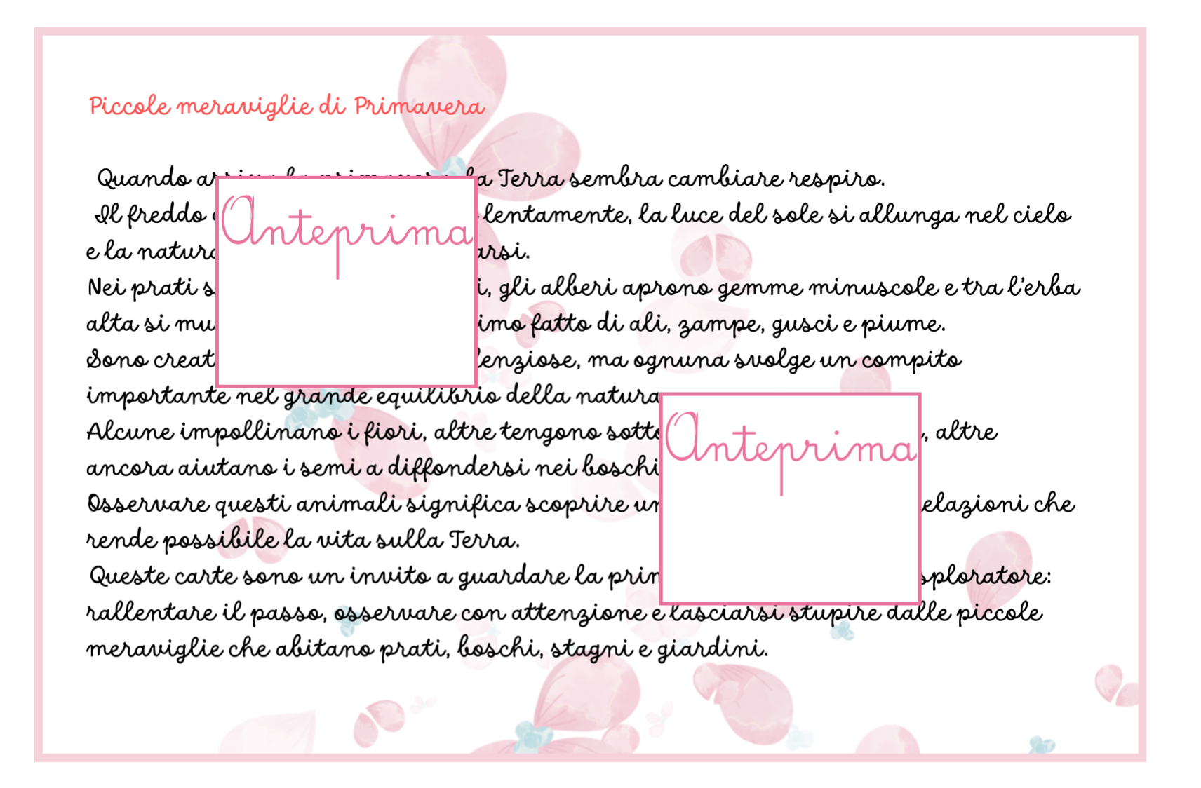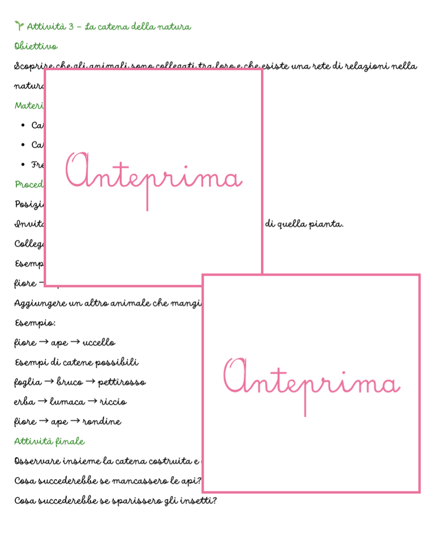 🌸 ANIMALI DELLA PRIMAVERA – CARTE SCIENTIFICHE MONTESSORI Scopri gli animali della primavera con un materiale scientifico, narrativo e manipolativo pensato per avvicinare i bambini alla natura. Con 20 carte Montessori e attività di classificazione e osservazione, i bambini imparano a conoscere gli animali che popolano prati, giardini e stagni, sviluppando curiosità scientifica e capacità di osservazione. Il materiale unisce narrazione, scienza e attività concrete, permettendo ai bambini di esplorare il mondo naturale in modo attivo e coinvolgente. 🐞 COSA TROVI NEL MATERIALE 📚 20 carte animali in tre parti immagine illustrata narrazione scientifica semplice e chiara scheda con informazioni essenziali 🔬 Ogni scheda include • habitat • alimentazione • ruolo ecologico • curiosità scientifiche 🧩 Materiali per le attività supporti stampabili per la classificazione supporti per l’associazione habitat carte per il gioco investigativo 🌿 ATTIVITÀ DIDATTICHE Il materiale propone tre attività progressive. 🔎 1. Classificazione degli animali I bambini osservano le carte e classificano gli animali nelle principali categorie zoologiche (insetti, uccelli, mammiferi, anfibi…). L’attività sviluppa pensiero logico e capacità di confronto. 🌾 2. Trova l’habitat I bambini leggono le informazioni e associano ogni animale al suo ambiente naturale: • prato • giardino • siepi • acqua L’obiettivo è comprendere il legame tra animale e ambiente. 🕵️ 3. Detective della natura Un gioco di osservazione e deduzione: attraverso indizi e caratteristiche, i bambini devono individuare l’animale corretto tra le carte. 🎯 OBIETTIVI EDUCATIVI Il materiale aiuta a sviluppare: • conoscenza degli animali della primavera • comprensione del concetto di habitat • prime competenze di classificazione scientifica • osservazione e pensiero logico • sensibilità verso natura ed ecosistemi ✂️ PREPARAZIONE SEMPLICE Il materiale è progettato per essere facile e veloce da preparare. Basta: • stampare le carte • stampare i supporti per le attività • ritagliare (eventualmente plastificare) Le attività possono essere svolte su tavolo o tappeto, individualmente o in piccolo gruppo. 👩🏫 IDEALE PER • scuola dell’infanzia • classe prima e seconda primaria • attività Montessori • laboratori di scienze • educazione ambientale • homeschooling 🧠 COMPETENZE SVILUPPATE • osservazione scientifica • classificazione • linguaggio scientifico di base • pensiero logico • consapevolezza ecologica 💡 Un materiale che unisce scienza, narrazione e gioco per far scoprire ai bambini le piccole meraviglie della natura. Stampabile, pronto all’uso, 31pagine