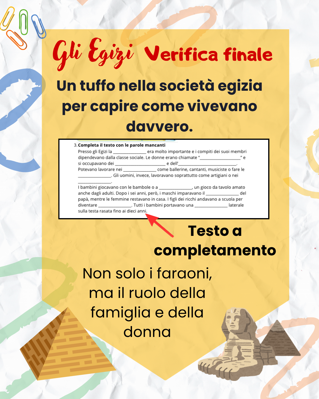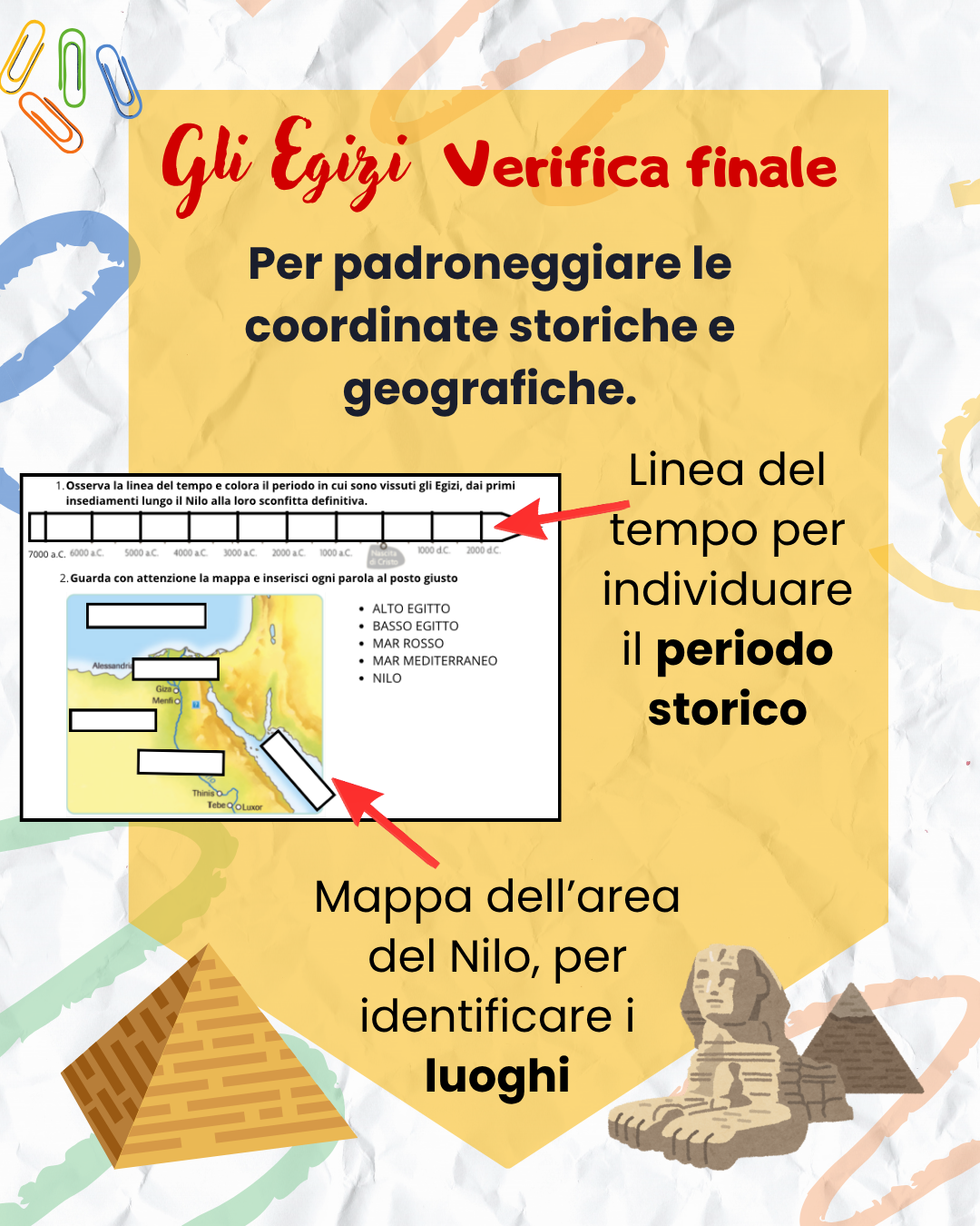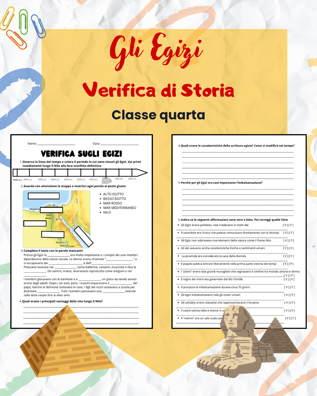 Rendi la valutazione un momento di scoperta con questa verifica strutturata sugli Antichi Egizi. Il materiale è stato progettato per coprire i nuclei tematici fondamentali della civiltà del Nilo, alternando diverse tipologie di esercizi per mantenere alta l’attenzione e testare diverse competenze.