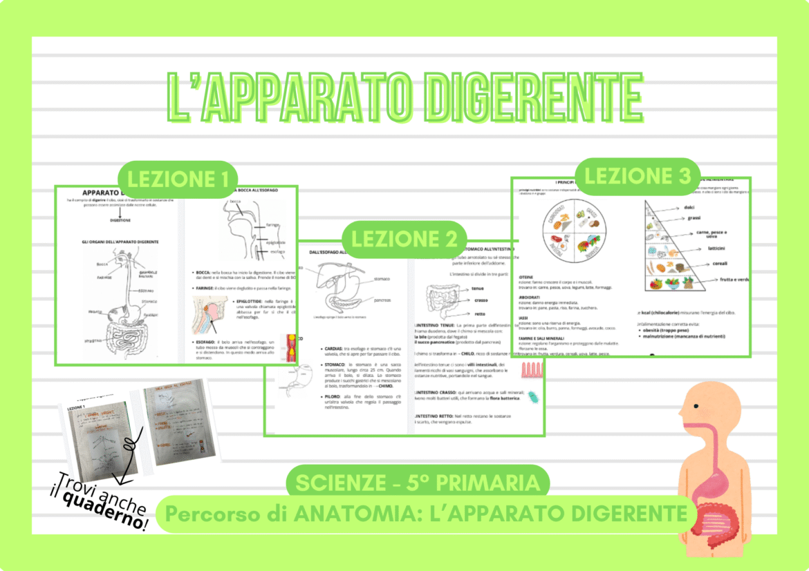 Il materiale è organizzato in circa tre lezioni chiare e progressive, che guidano i bambini passo dopo passo nello studio della digestione: dagli organi coinvolti fino ai principi nutritivi e alla piramide alimentare.