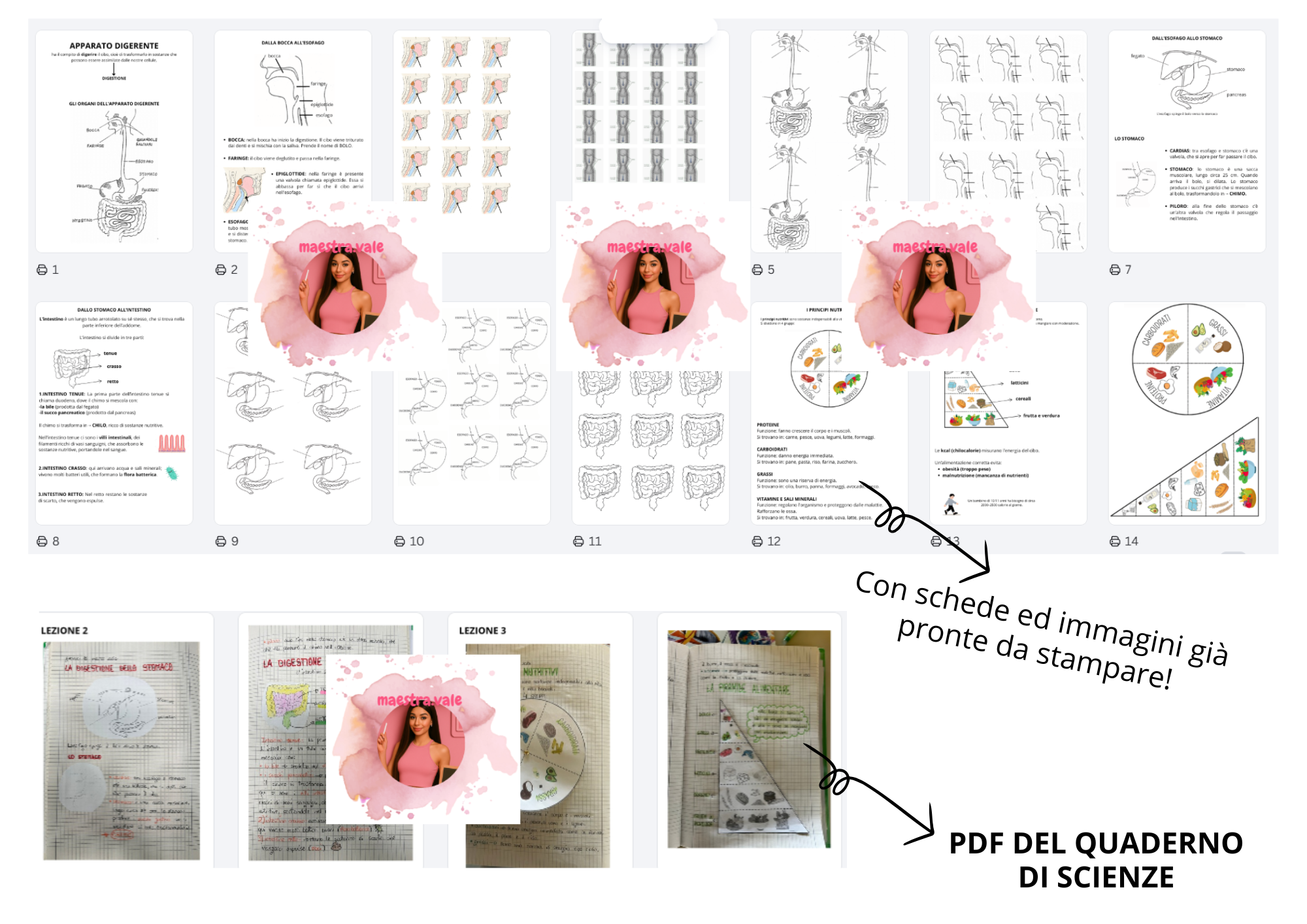 Il materiale è organizzato in circa tre lezioni chiare e progressive, che guidano i bambini passo dopo passo nello studio della digestione: dagli organi coinvolti fino ai principi nutritivi e alla piramide alimentare.