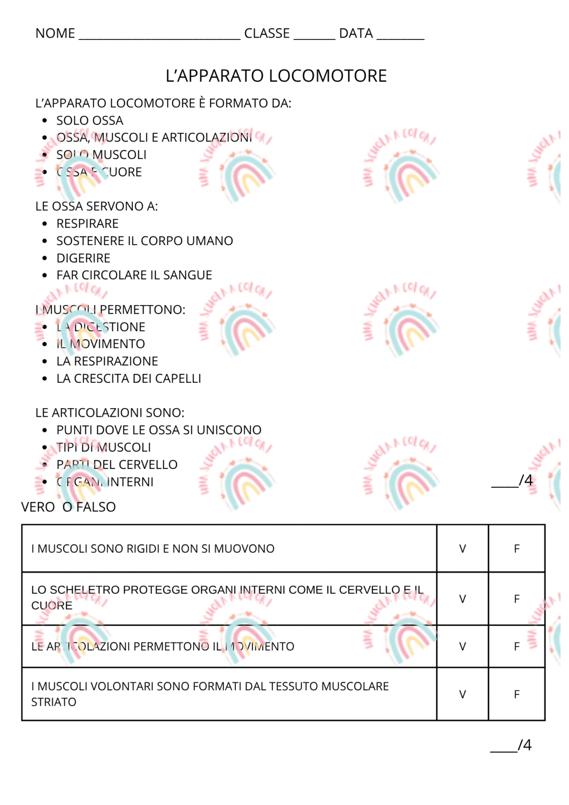 prova di verifica sull’apparato locomotore con esercizi di vero o falso, domande a scelta multipla, completamenti e domande aperte.