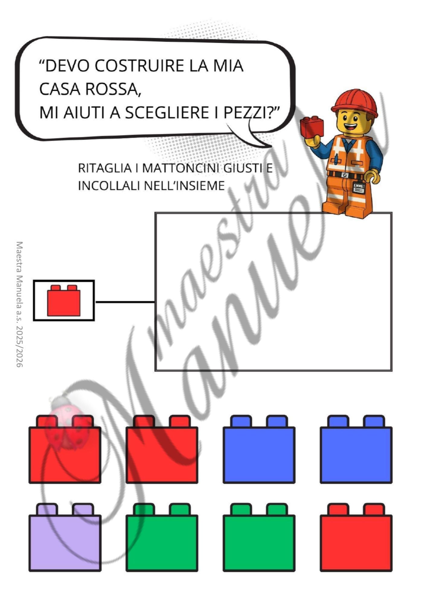 Ha bisogno del nostro aiuto per sistemare i pezzi Lego: alcuni appartengono al suo progetto, altri non appartengono e finiscono nel mucchietto sbagliato.