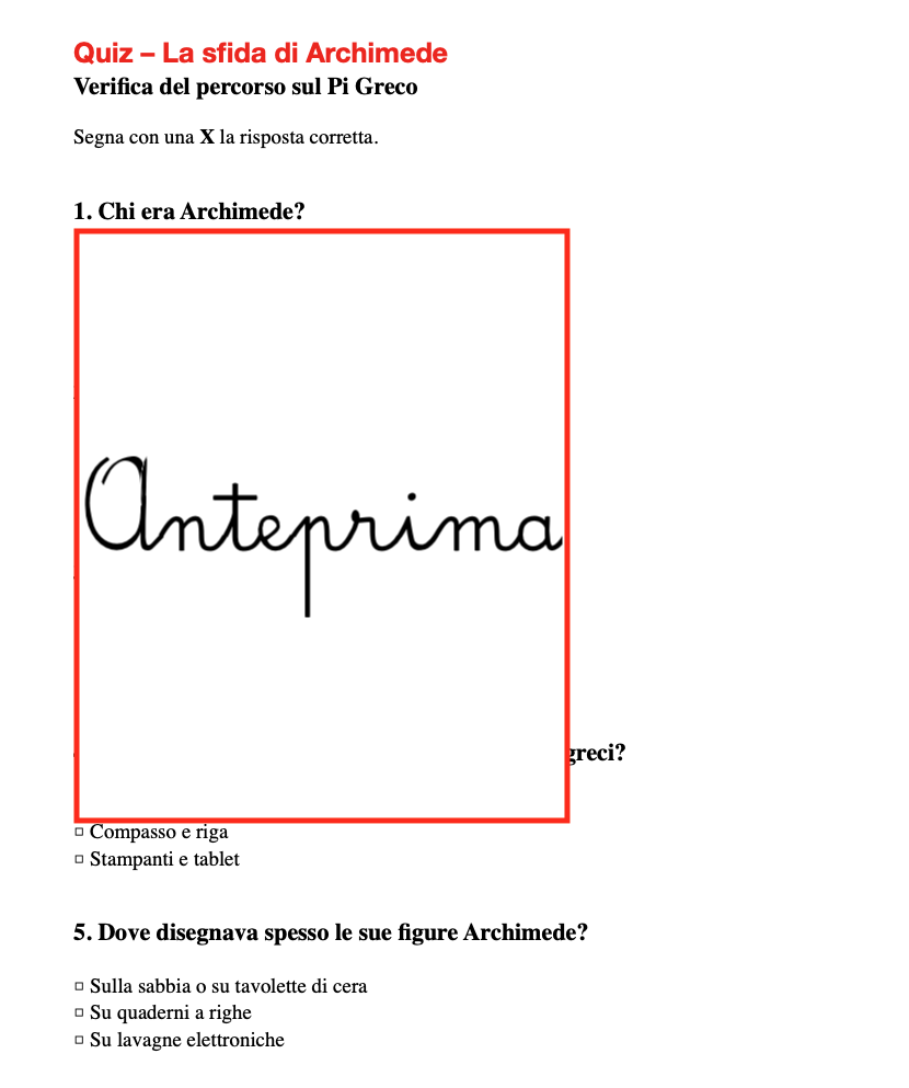 Archimede e il segreto dei cerchi Un percorso narrativo e laboratoriale per scoprire il Pi Greco Il Pi Greco è uno dei numeri più affascinanti della matematica. Compare in ogni cerchio, in ogni ruota, in ogni orbita, ma spesso a scuola viene presentato solo come una formula da ricordare: 3,14. Questo percorso nasce da un’idea diversa: accompagnare i bambini a scoprire il Pi Greco attraverso la curiosità, la storia e l’esperienza. Il punto di partenza è una domanda semplice e potente: Come si può misurare il contorno di un cerchio? Per esplorare questa domanda incontriamo uno dei più grandi matematici dell’antichità: Archimedes. Attraverso una narrazione accessibile ai bambini, il materiale introduce la Grecia antica, gli strumenti dei matematici greci e la grande sfida che affascinò Archimede: capire il rapporto tra il diametro e la circonferenza. Con pochi strumenti semplici – riga, compasso, corde e sabbia su cui disegnare – i matematici dell’antichità riuscirono a sviluppare idee straordinarie. Archimede ebbe un’intuizione geniale: se non si può misurare una linea curva direttamente, si può avvicinare la curva con tante linee dritte. Disegnando poligoni con sempre più lati dentro e fuori dal cerchio, Archimede riuscì a intrappolare la circonferenza tra due misure sempre più precise. Da questo ragionamento scoprì qualcosa di sorprendente: il contorno di ogni cerchio è sempre poco più di tre volte il suo diametro. Questo rapporto speciale è proprio il numero che oggi chiamiamo π (Pi Greco). Il percorso proposto nel materiale permette ai bambini di ripercorrere questa scoperta attraverso attività concrete, esperimenti e momenti di osservazione. Le attività guidano gli alunni a: misurare la circonferenza di oggetti reali con il filo osservare il rapporto tra circonferenza e diametro scoprire empiricamente che il diametro entra circa tre volte e un pezzetto nella circonferenza comprendere il metodo dei poligoni utilizzato da Archimede In questo modo il Pi Greco non viene semplicemente spiegato, ma scoperto attraverso l’esperienza. Il percorso si arricchisce inoltre di una curiosità culturale che avvicina la matematica al mondo dei bambini: il personaggio Disney Archimede Pitagorico, geniale inventore del mondo di Paperino e Zio Paperone. Il suo nome è un omaggio proprio al grande matematico di Siracusa. Da qui nasce una sfida finale: immaginare e progettare una macchina capace di misurare i cerchi. I bambini diventano così piccoli inventori, proprio come Archimede. Il materiale include anche un quiz di verifica con tavola di controllo, utile per consolidare i concetti appresi e verificare la comprensione del percorso. Questo progetto può essere utilizzato in diversi contesti didattici: come laboratorio per il Pi Greco Day all’interno di attività di matematica e geometria in percorsi STEM in attività interdisciplinari che collegano storia, scienza e creatività Attraverso il racconto, l’esperienza e l’immaginazione, i bambini scoprono che la matematica non è solo fatta di numeri e formule, ma nasce dalla curiosità di osservare il mondo e di porsi domande. Proprio come fece Archimede più di duemila anni fa. Materiale stampabilepronto all’uso, 14 pagine