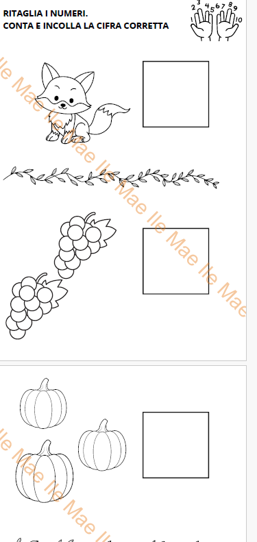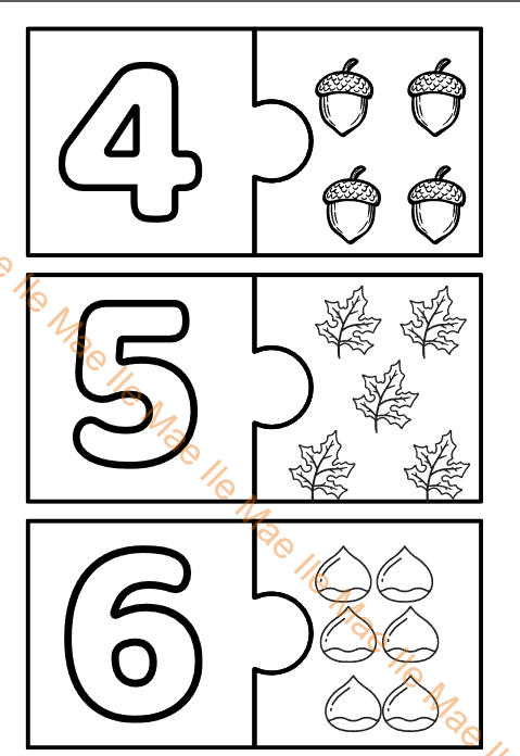 In questa attività vengono presentati gruppi di simboli autunnali (foglie, zucche, ghiande, ecc.). I bambini devono contare gli elementi di ogni gruppo e poi ritagliare e incollare il numero corrispondente accanto all’immagine