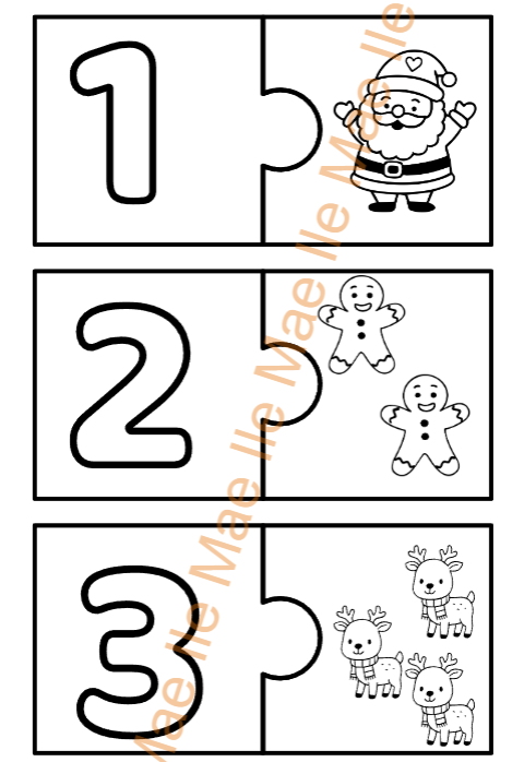 La prima attività è un puzzle dei numeri con immagini natalizie, disponibile sia in bianco e nero che a colori: i bambini ricompongono le immagini ordinando i numeri da 1 a 10.