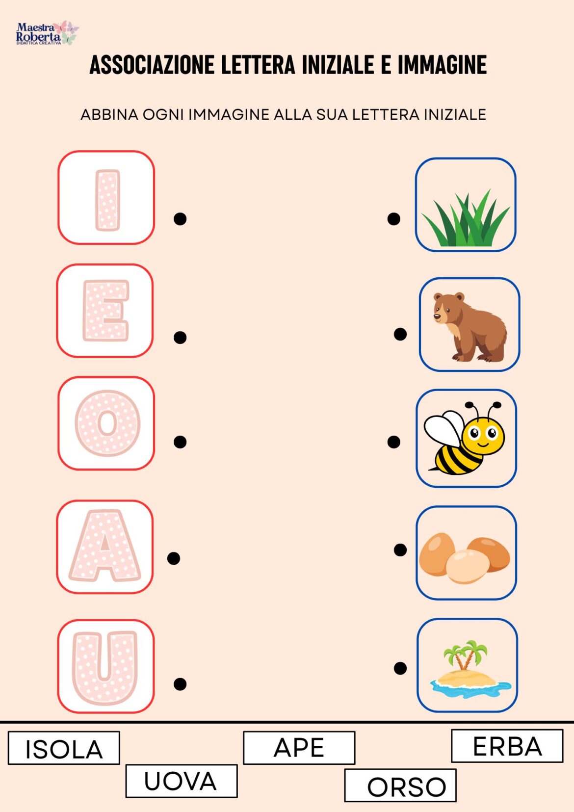 Note aggiuntive per i genitori Attività: “Ascolto, riconosco e associo le vocali” Obiettivo dell’attività: Aiutare i bambini a riconoscere e collegare i suoni delle vocali (A, E, I, O, U) alle immagini di oggetti o animali che iniziano con la stessa vocale. Come si svolge: Il bambino osserva la scheda: a sinistra ci sono le vocali, a destra le immagini. L’adulto pronuncia lentamente una vocale, invitando il bambino ad ascoltare con attenzione. Il bambino cerca l’immagine che inizia con quel suono e traccia una linea per collegarla alla vocale corrispondente. Dopo aver completato tutti gli abbinamenti delle immagini ,il bambino, se capace, puo' passare a quello delle parole. Cosa si sviluppa: Riconoscimento dei suoni delle vocali Attenzione e concentrazione Coordinazione occhio-mano Arricchimento del linguaggio Suggerimenti per casa: Ripetere insieme i suoni delle vocali, esagerando la pronuncia per renderli più chiari. Cercare oggetti in casa che iniziano con le diverse vocali. Trasformare l’attività in un piccolo gioco di ascolto e scoperta. Durata consigliata: 15-20 minuti, in un momento tranquillo e sereno.
