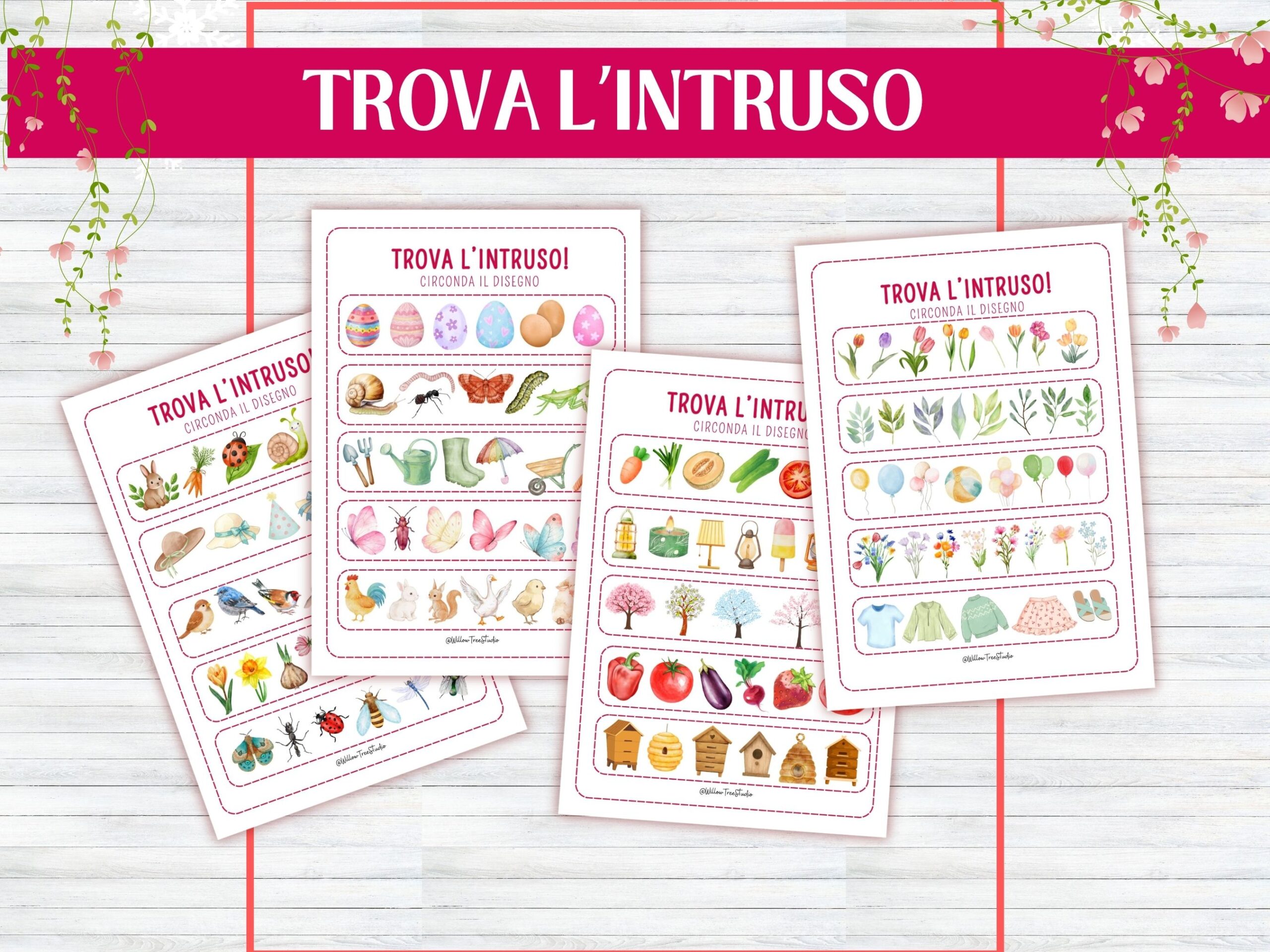 – 4 pagine di esercizi “Trova l’intruso” – Individua l’elemento che non c’entra in ogni gruppo