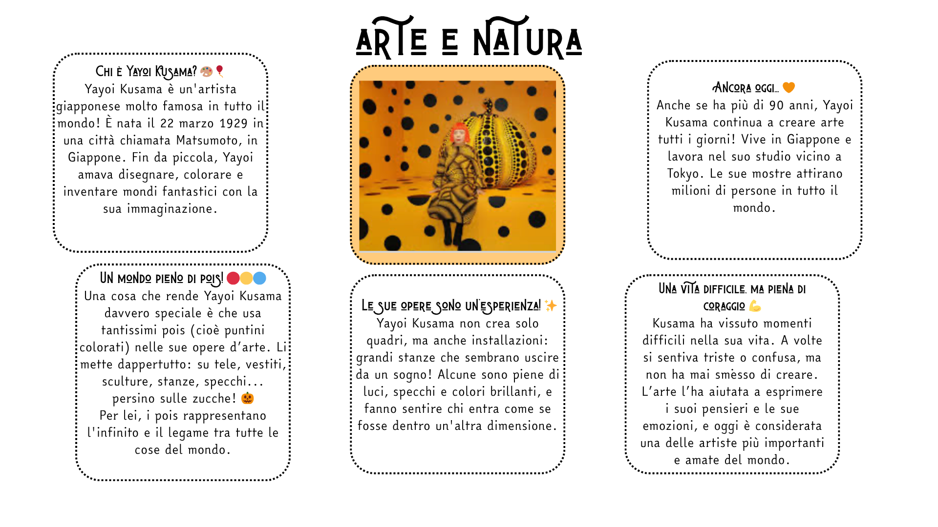 Inoltre, il percorso presenta delle attività laboratoristi di arte e immagine sulle zucche dell’artista giapponese Yayoi Kusama; pois in tinte e colori differenti che caratterizzano le sue opere.