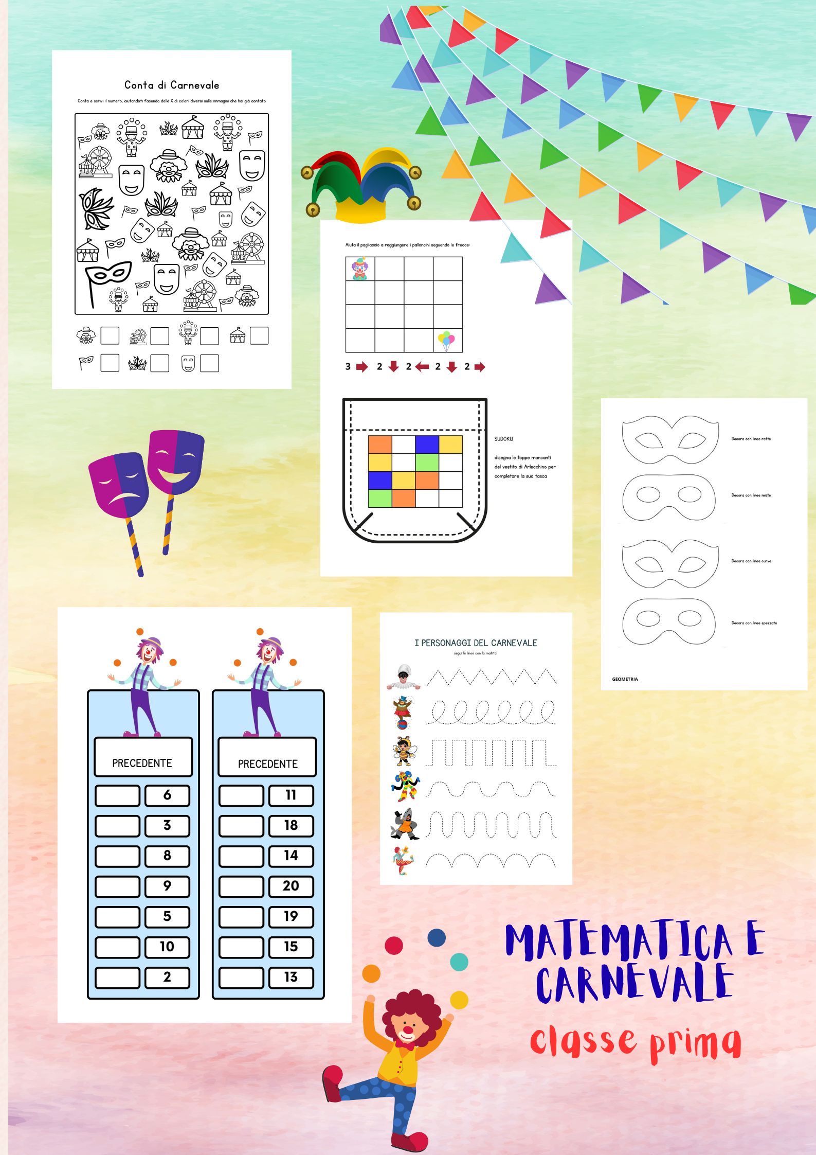 Un allegro pacchetto di 12 schede didattiche di matematica a tema Carnevale, pensato per la classe prima!