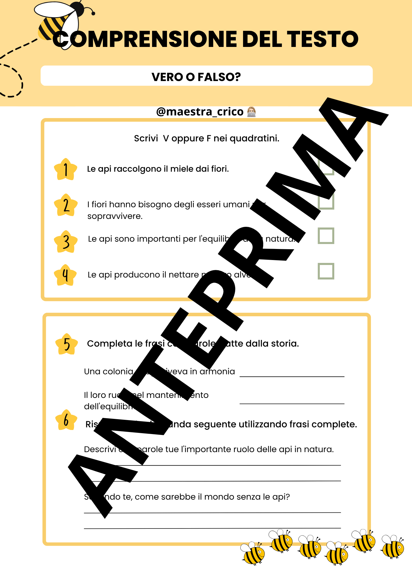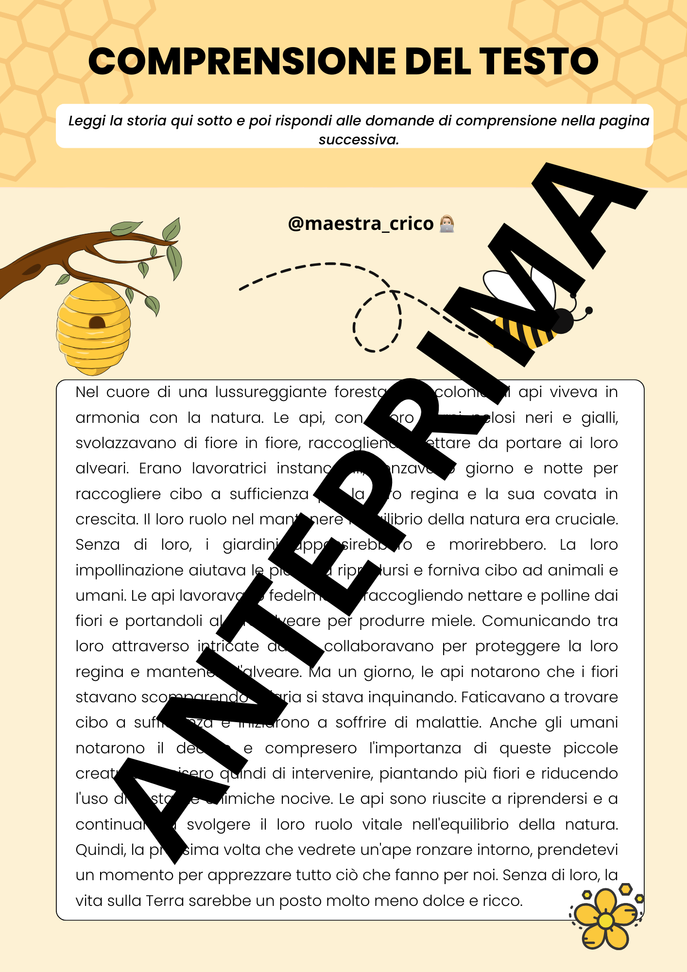 - Comprensione del testo: Una storia affascinante sulle api, seguita da esercizi di vero/falso, completamento e domande aperte per stimolare la riflessione e la discussione.