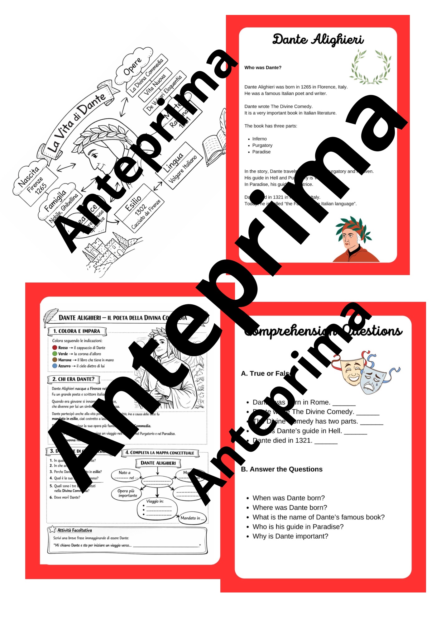 - **Un viaggio nella vita di Dante:** Schede chiare e concise sulla biografia del Sommo Poeta, dal suo esilio alle sue opere immortali.