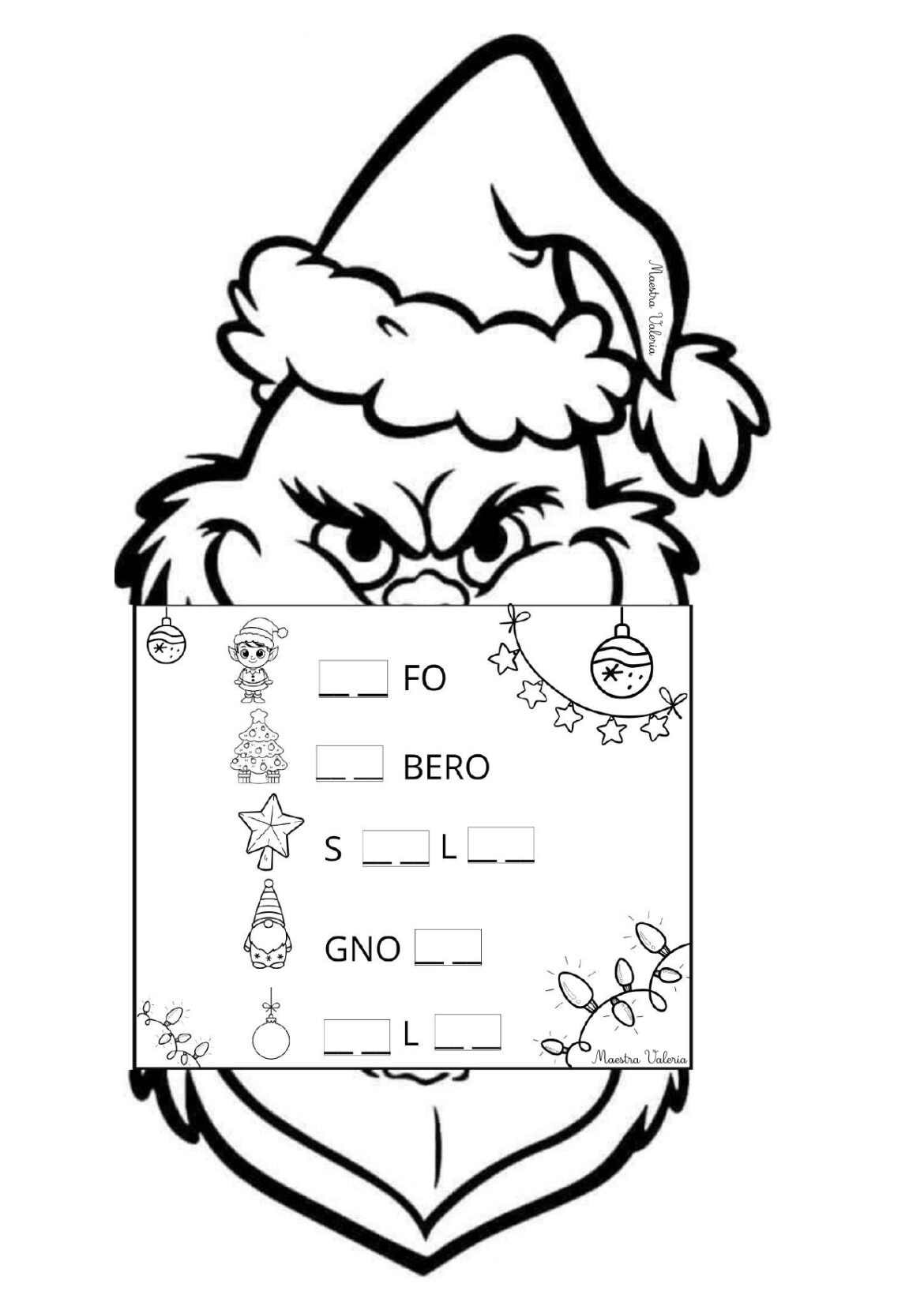 - Completa le parole a tema natalizio: un esercizio stimolante per consolidare il vocabolario e la conoscenza delle lettere, con un tocco di simpatia del Grinch e di Babbo Natale