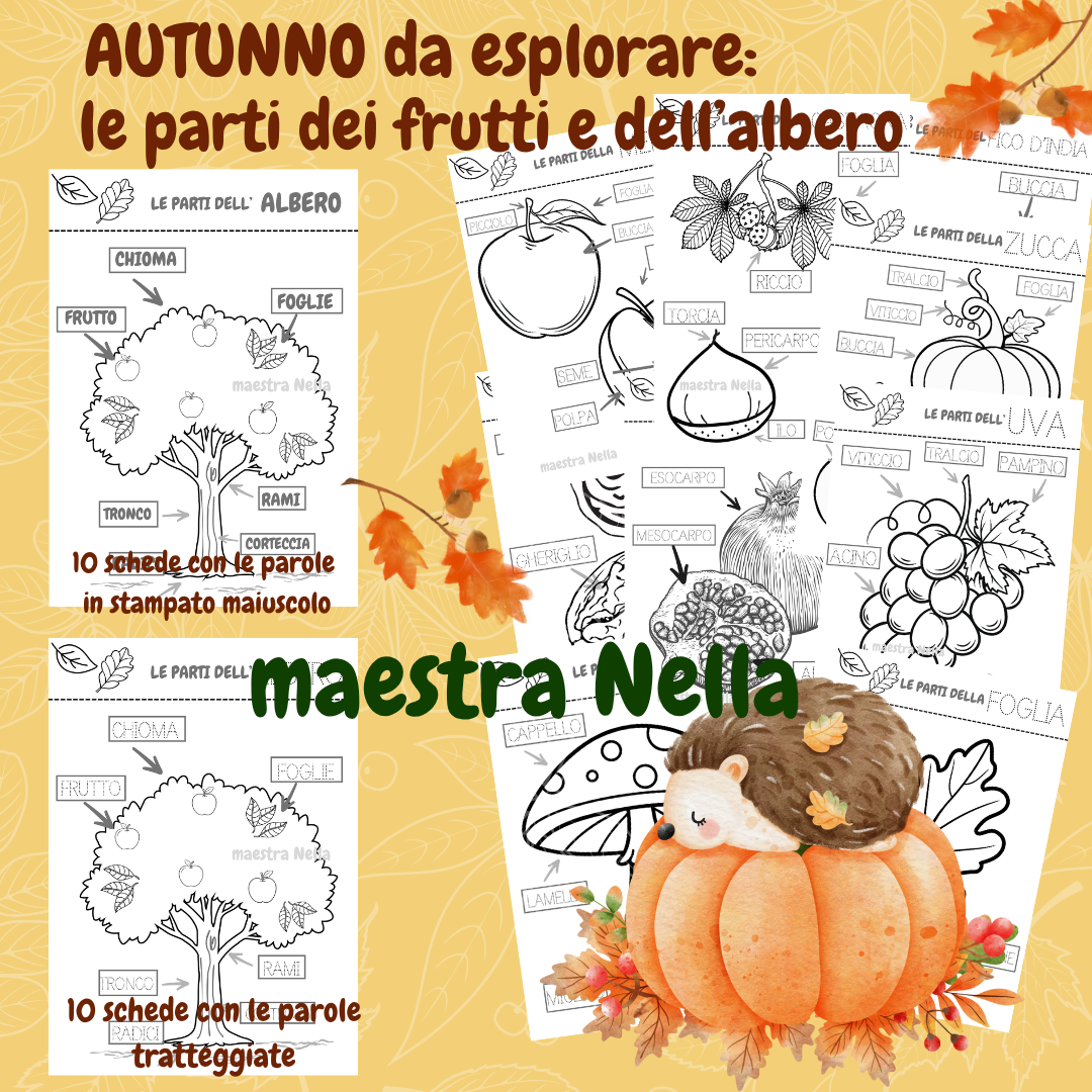 Ogni scheda presenta le parti principali di alcuni protagonisti di questa stagione: l’albero, la castagna, la zucca, il melograno, l’uva, il fico d’India e altri ancora.
