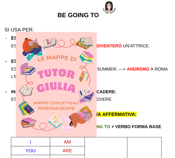 Schema sull’utilizzo e la formazione di “Be going to”: forma affermativa, negativa, interrogativa e risposte brevi.