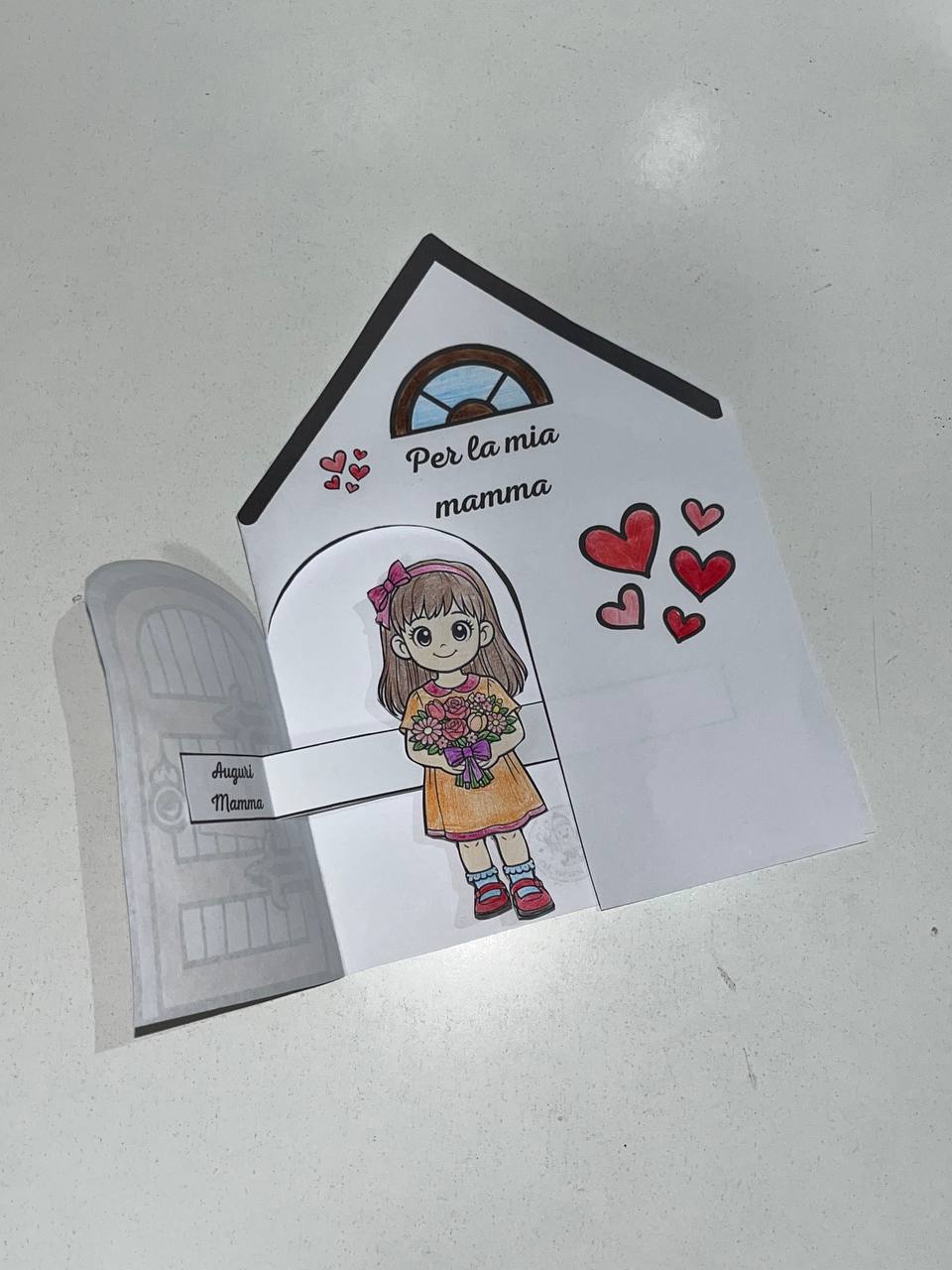Un originale biglietto per la Festa della Mamma con porta apribile, pensato per la scuola dell’infanzia e primaria. I bambini colorano, ritagliano e assemblano la casetta: aprendo la porta si scopre una dolce sorpresa con un messaggio speciale per la mamma.