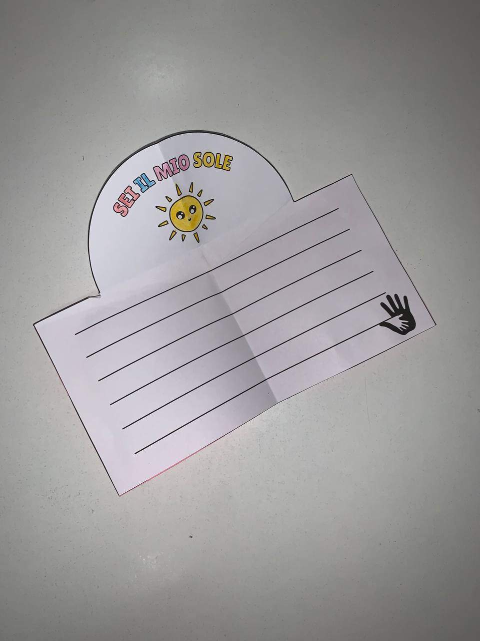 Il biglietto festa della mamma sole è un’attività semplice e significativa pensata per la scuola primaria, perfetta per accompagnare i bambini nella realizzazione di un dono speciale e personale. Aprendo il biglietto, compare la dolce frase “Sei il mio sole”, accompagnata da uno spazio con righe guida dove ogni bambino può scrivere un pensiero dedicato alla propria mamma.