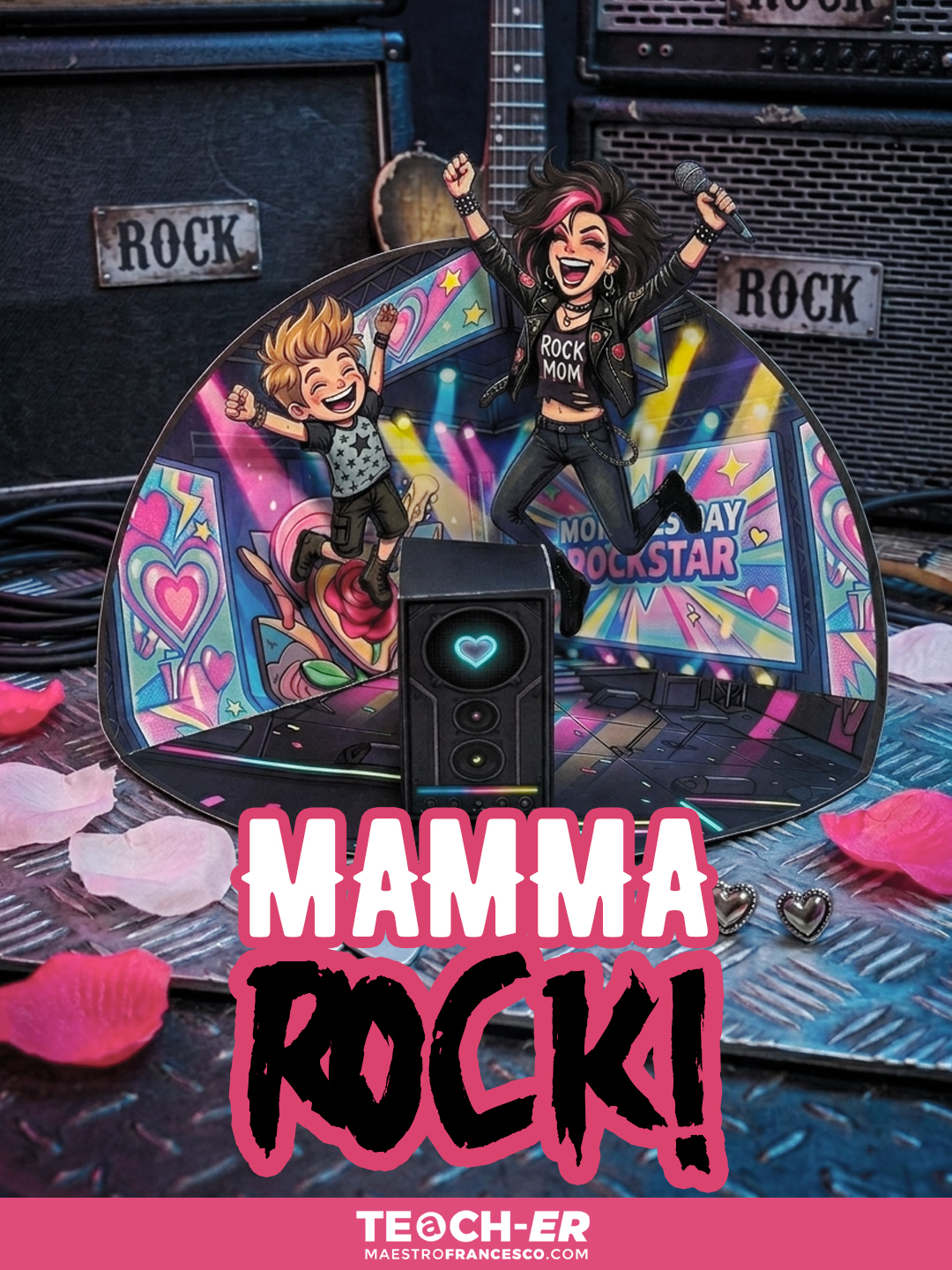 Niente fiori (o meglio, solo quelli disegnati!), quest’anno il regalo per la mamma ha un volume altissimo! Ho assemblato questo mini-set rock per ricordarle che è lei la protagonista assoluta.