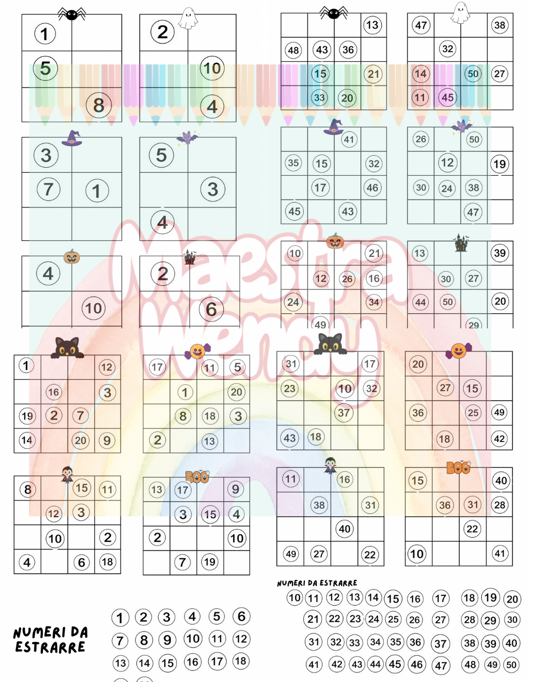 • Ogni versione include 10 cartelle Bingo uniche, decorate con simpatiche illustrazioni a tema Halloween (fantasmi, zucche, ragni e pipistrelli).