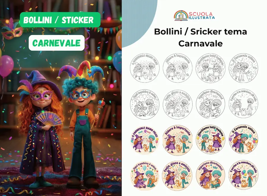 🎭 Bollini & Sticker di Carnevale – Scuola Illustrata