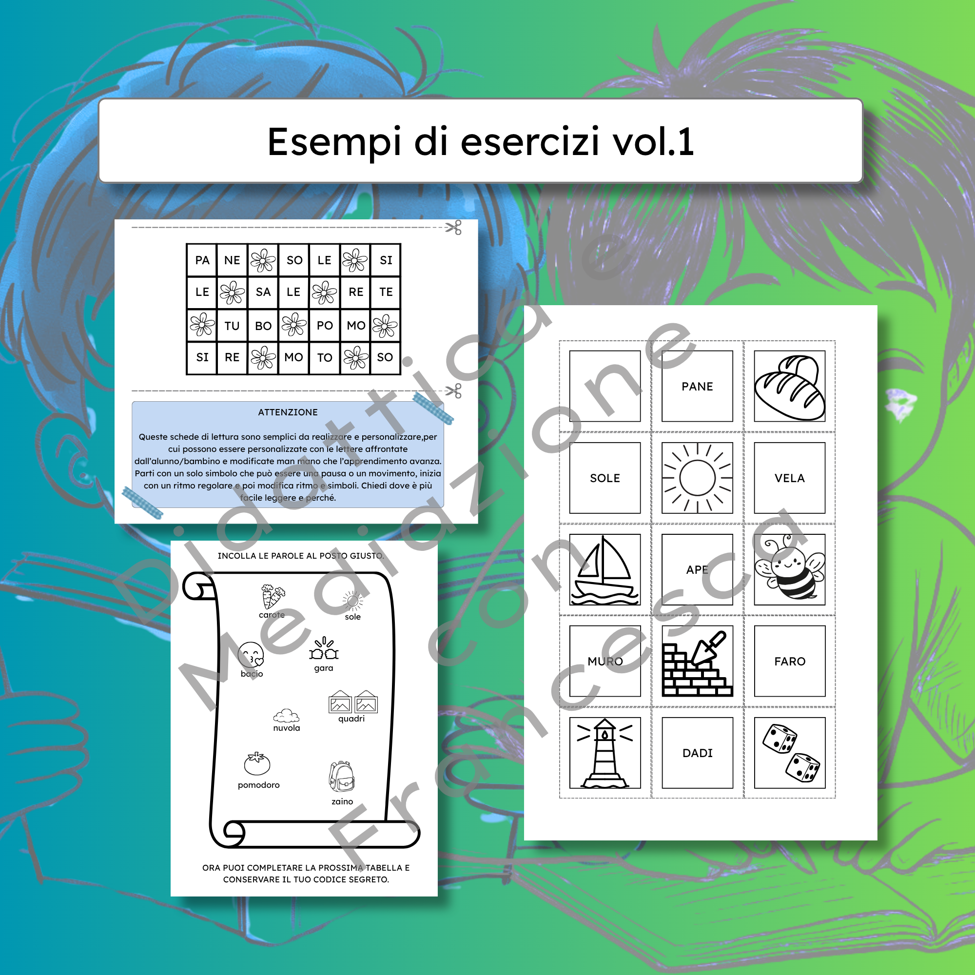 L’intero percorso didattico in un unico pacchetto. Dalla decodifica adella sillaba alla costruzione della frase, 130 pagine di materiali operativi progettati per bambini con BES, DSA e primi apprendimenti con approccio legato al Metodo Feuerstein.