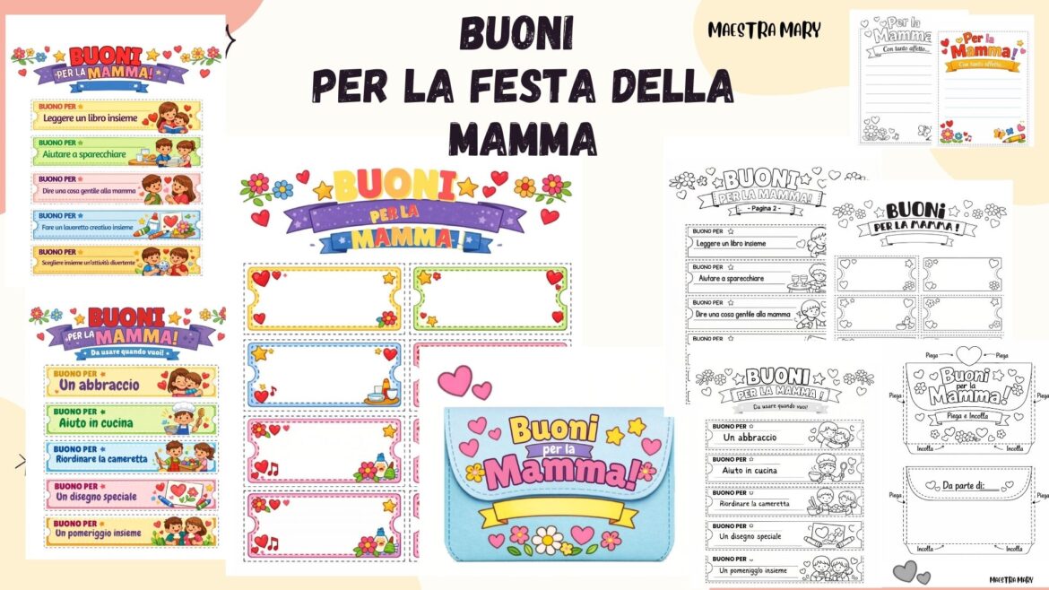 Nel set sono incluse sia la versione a colori che quella in bianco e nero dei buoni, oltre a una deliziosa bustina da ritagliare per raccoglierli tutti .Come extra speciale,ho incluso una letterina già pronta da compilare dai bambini e dedicare alla loro mamma, per rendere il momento ancora più speciale e personale sempre in entrambe le versioni ovvero colorata e in bianco e nero. Maestra Mary