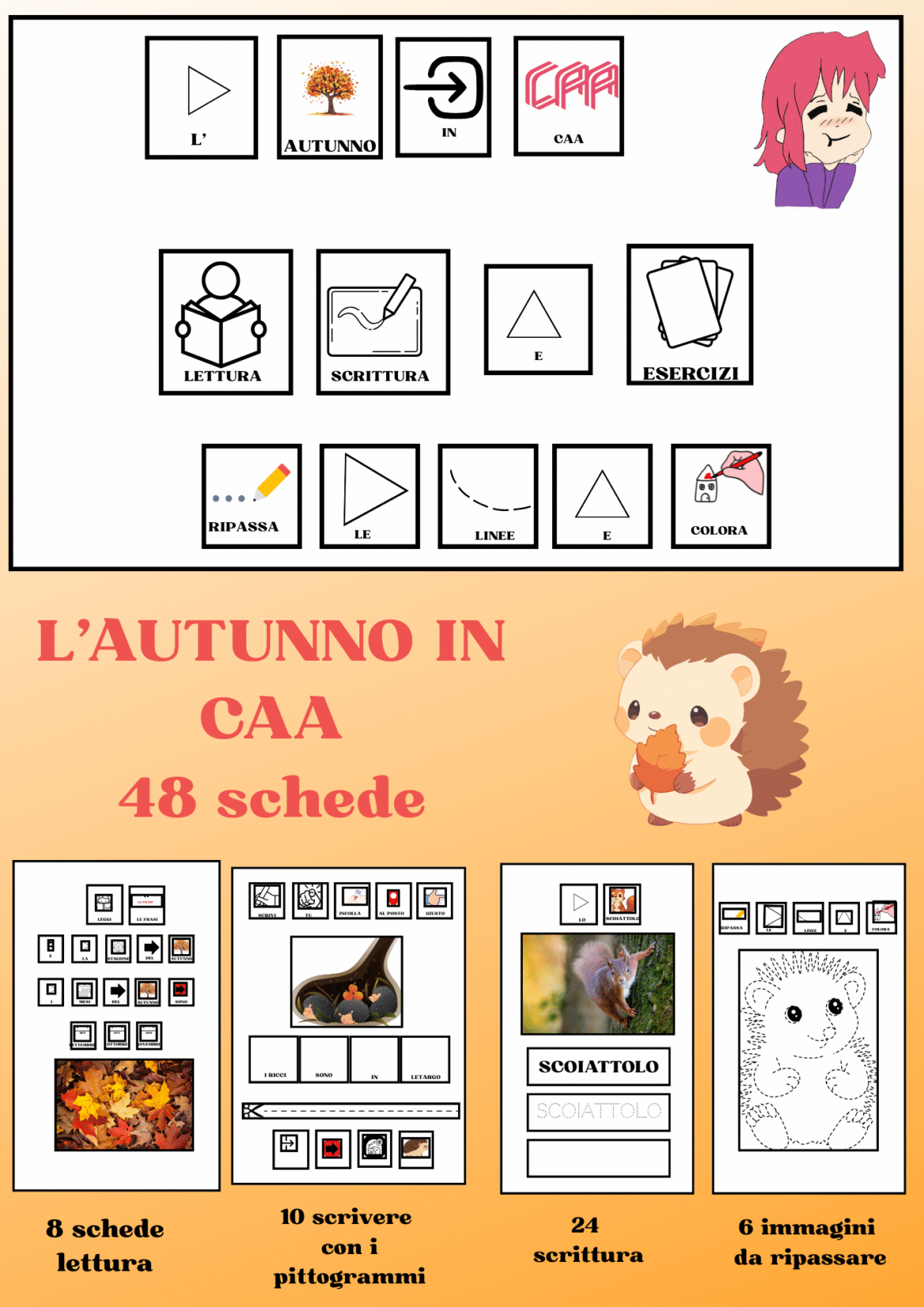 - 10 schede scrittura con i pittogrammi incolla i pittogrammi e forma la frase (Le foglie cadono per terra, la foglia è rossa, la foglia è marrone, la foglia e gialla, la foglia è arancione, l’orso è in letargo, i ricci sono in letargo, la bambina mangia la mela, il bambino salta nelle pozzanghere, lo scoiattolo ha una ghianda)